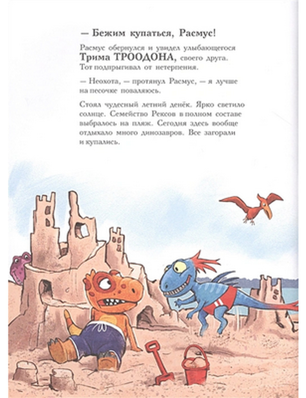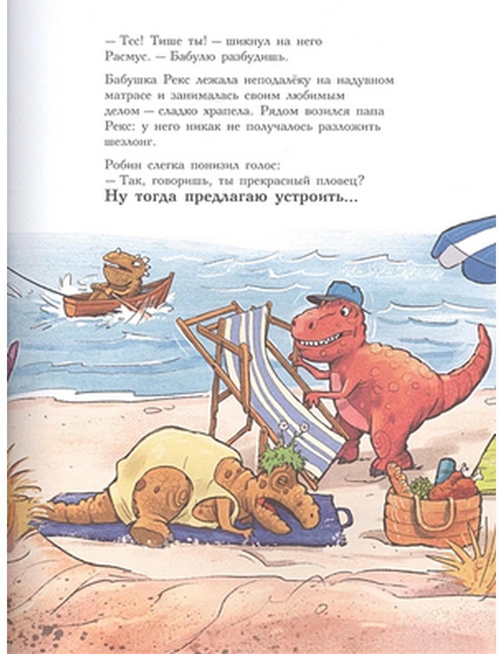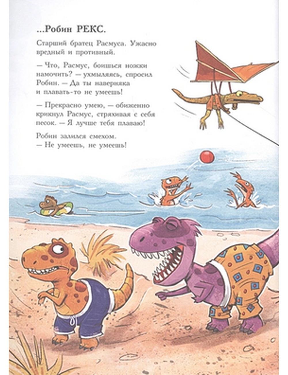 Каждая книга серии «Друзья-динозаврики» рассказывает об одном дне из жизни тираннозаврика Расмуса Рекса и его лучшего друга Трима Троодона. Во второй книге действие происходит на пляже Маленького озера, куда по случаю солнечной погоды пришла позагорать вся семья Рексов. Трим зовет Расмуса купаться, но тому больше нравится лежать на теплом песочке. Тут появляется старший братец Расмуса Робин и, как обычно, начинает задираться и дразниться. А потом предлагает Расмусу и Триму устроить заплыв до острова и обратно. Вся эта затея не сулит Расмусу ничего хорошего: сказать по правде, плавает он неважно, да еще эти слухи о морском чудовище, которое якобы видели в озере. Скрепя сердце он принимает вызов, только чтобы доказать противному братцу, что никакой он не трус. Никто не сомневается, что победит Робин — он всегда выигрывает. Однако совершенно неожиданно у Расмуса находится защитник, и Робин получает хороший урок.
