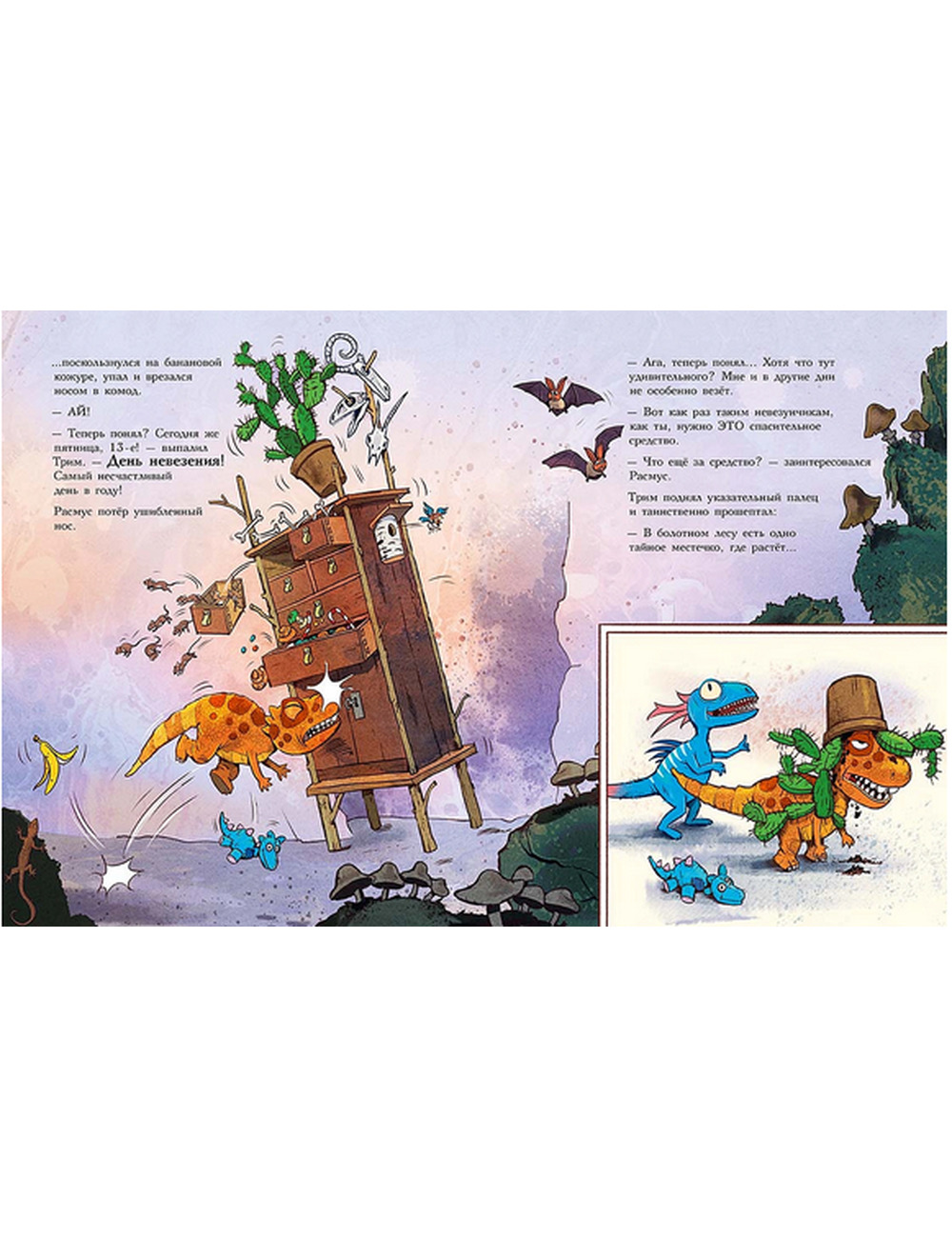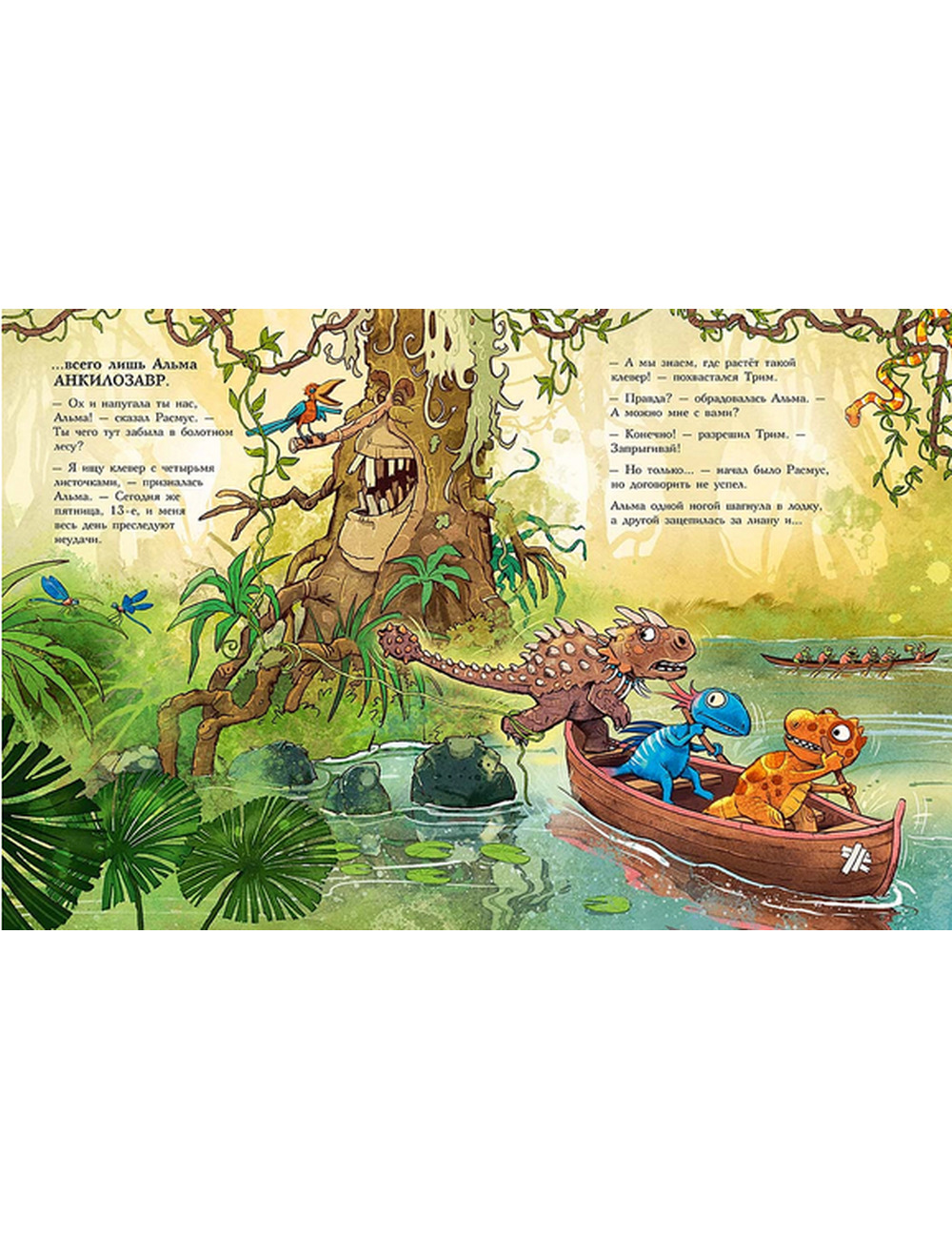 Ни свет ни заря Расмуса Рекса разбудил его лучший друг Трим Троодон. Не успел Расмус встать с кровати, как поскользнулся, упал и врезался носом в комод. А всего через пару минут под ним проломилась половица, и он свалился в подвал. Почему же день не задался с утра? Да потому, что сегодня пятница, 13-е — день невезения! Но Трим знает способ, как избавиться от всех несчастий. Надо найти клевер-четырёхлистник, закрыть глаза, загадать желание, бросить клевер через левое плечо, и — опля! — желание сбудется! Правда, растёт этот ключик к удаче в самой чаще болотного леса, на лугу под Голубой горой. Друзья берут у папы Рекса лодку и отправляются за клевером по реке, даже не представляя, сколько опасностей их ждёт впереди...