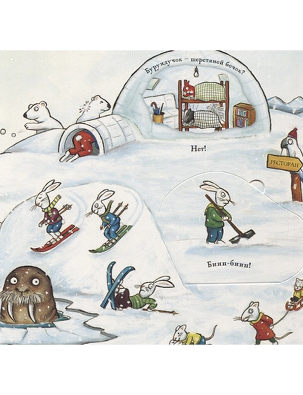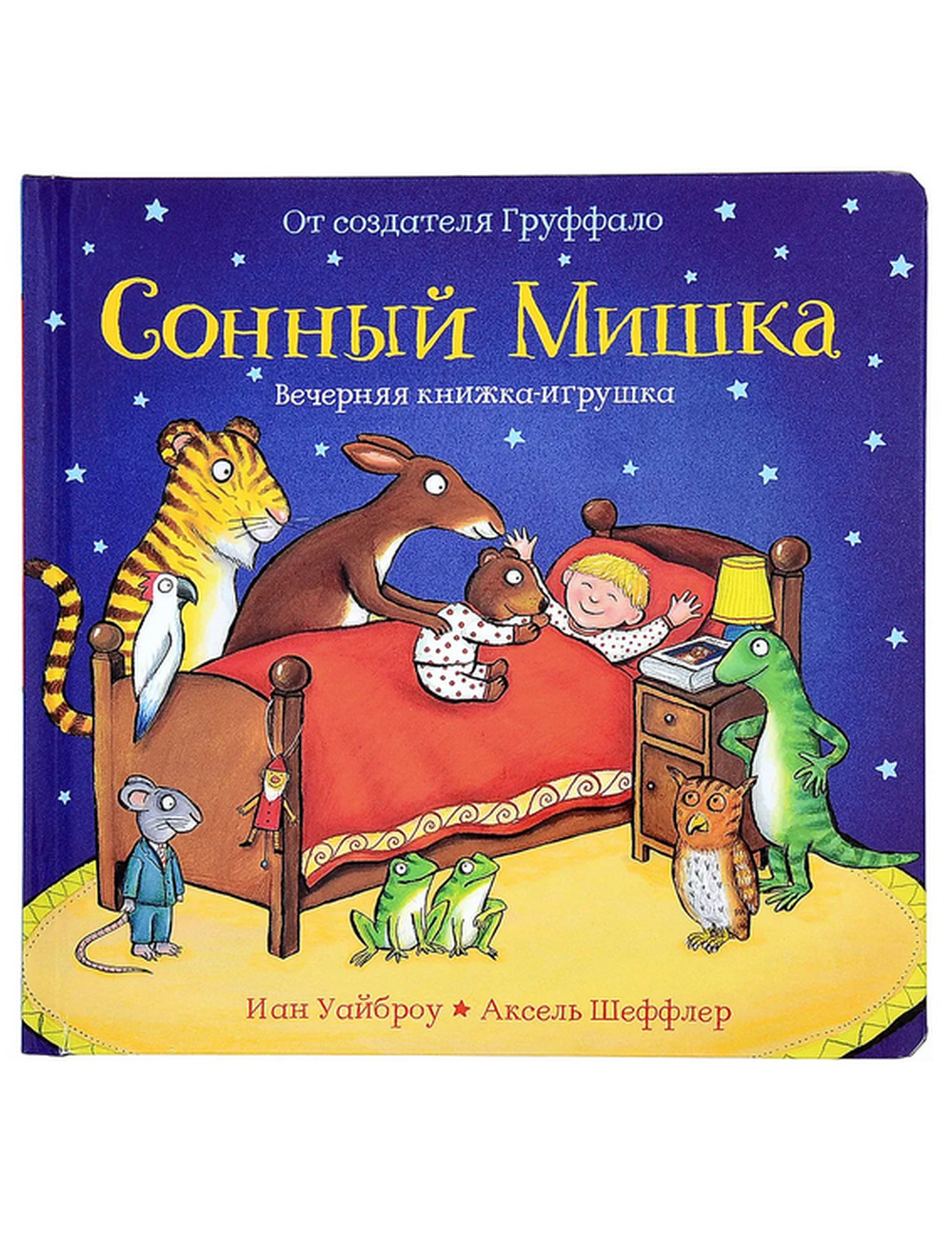 На педали жмёт тигрёнок,Сонный мишка позади. .Звери в домиках зелёных .Спать ложатся - погляди! .Вот он, мишка, с которым так хорошо засыпать. А что он делал днём? Может, ехал к вам издалека, торопился, боялся опоздать? Ну, а вы читайте и рассматривайте книжку не спеша. Потому что вас ждут сюрпризы! .Для детей не достигших 6 лет. .Для чтения взрослыми детям.
