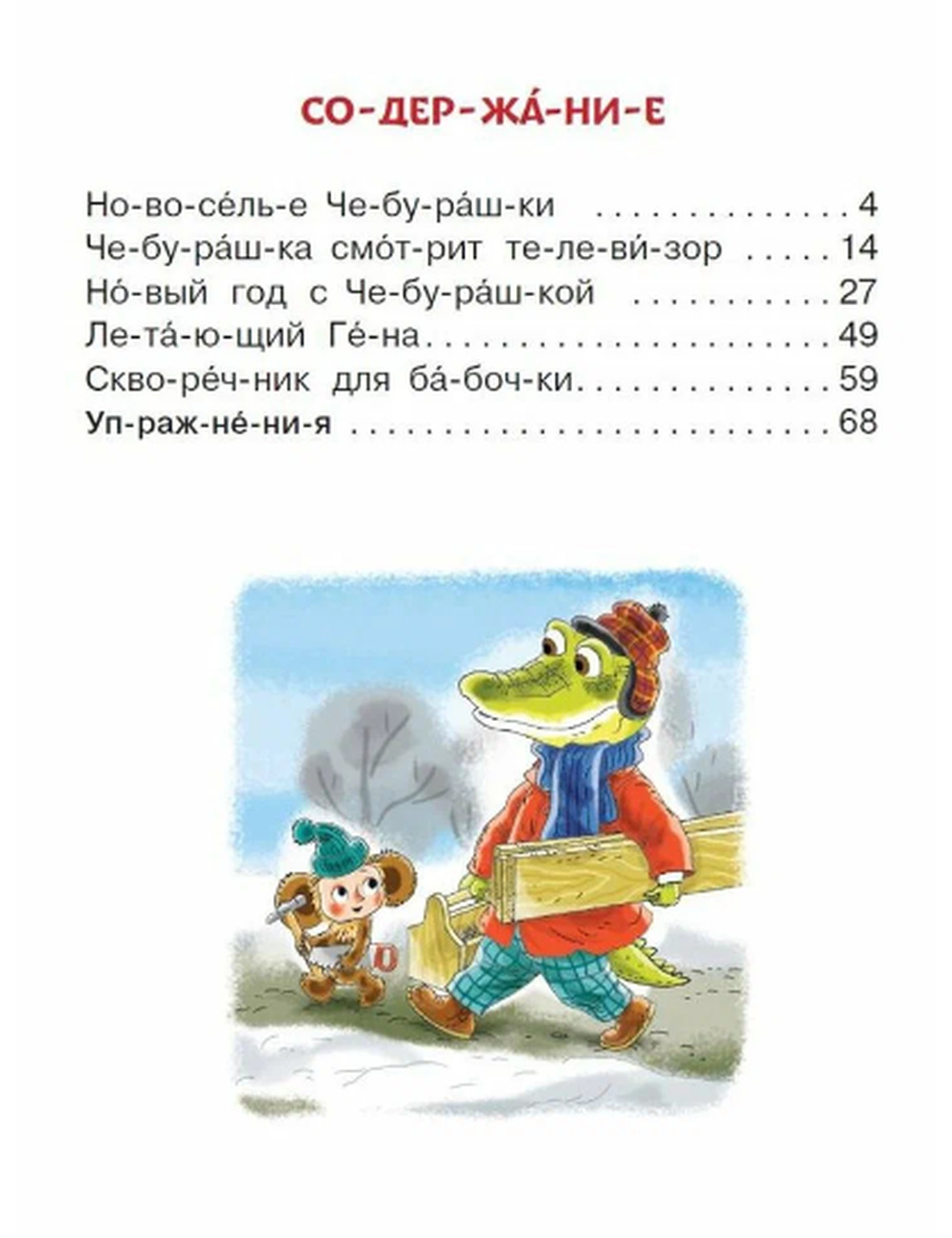 В этой книге малыши познакомятся с весёлыми приключениями Чебурашки и крокодила Гены. Вместе с героями сказок ребята спасут новогодний праздник, обезвредят опасных пиратов и построят скворечник для бабочек. Добрые и забавные истории научат малышей дружбе и вежливости. А крупные буквы и ударения позволят начинающим читателям самостоятельно познакомиться с знаменитыми сказками.
