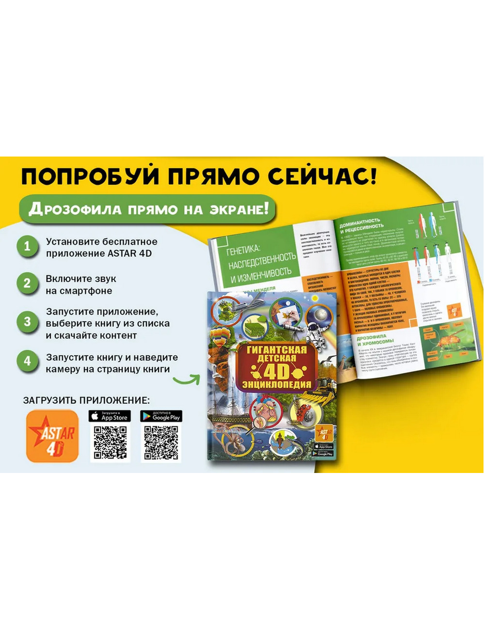 Эта развивающая 4D-энциклопедия с элементами дополненной реальности приводит разносторонние сведения из различных областей знаний, тем самым помогая глубже изучить окружающий мир в его многообразии. Образование Вселенной, зарождение жизни, эволюция и естественный отбор, возникновение человека, анатомия и физиология, технический прогресс и исследование космоса - яркий рассказ обо всем этом впечатляет и вызывает желание провести собственный научный эксперимент. И книга дает читателю такую возможность: здесь имеются описание и анимация несложных, но полезных познавательных опытов. А благодаря использованию технологий дополненной реальности иллюстрации на этих страницах можно изучить не только в цвете, но и в объеме, движении и со звуковыми эффектами. Издание расширяет кругозор и помогает лучше познать мир, в котором мы живем.