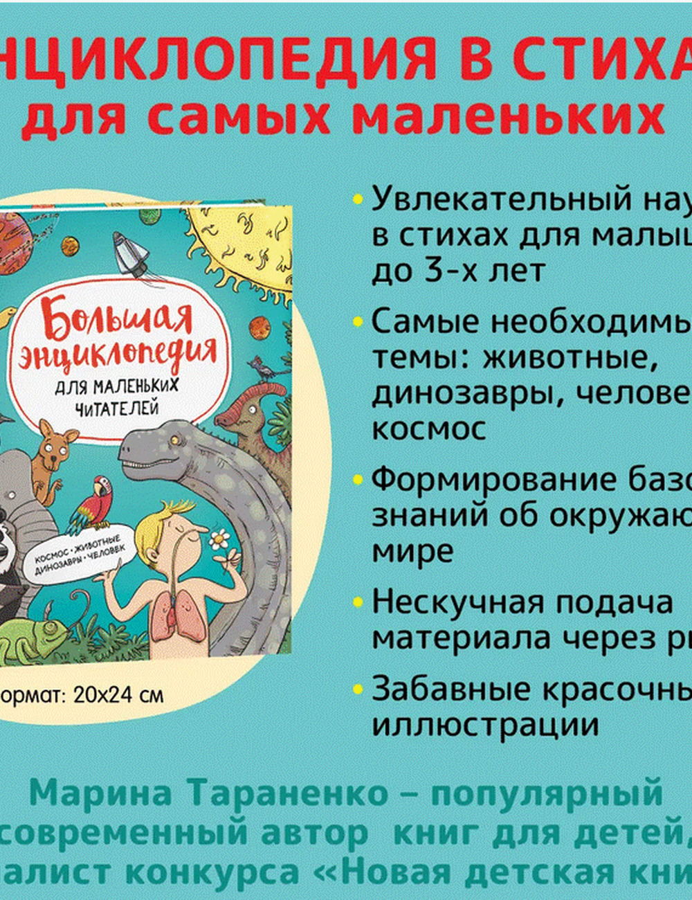 Пожалуй, это одна из самых милых и увлекательных энциклопедий на свете! Все познавательные факты в ней изложены в звонких, запоминающихся стихах. Чтобы малышам до 3-х лет было интересно изучать окружающий мир, каждую страницу украшают красочные сюжетные иллюстрации.
