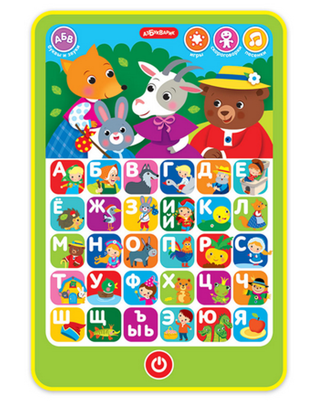 С этим музыкальным планшетом с азбукой ваш малыш легко запомнит все буквы русского алфавита! Ведь азбука здесь по-настоящему волшебная - учить алфавит помогают любимые сказочные персонажи. На каждую букву русского алфавита в обучающем планшетике «Азбука сказок» свой герой: Б – Баба-яга, Г – гуси-лебеди, Ж – Жар-птица!