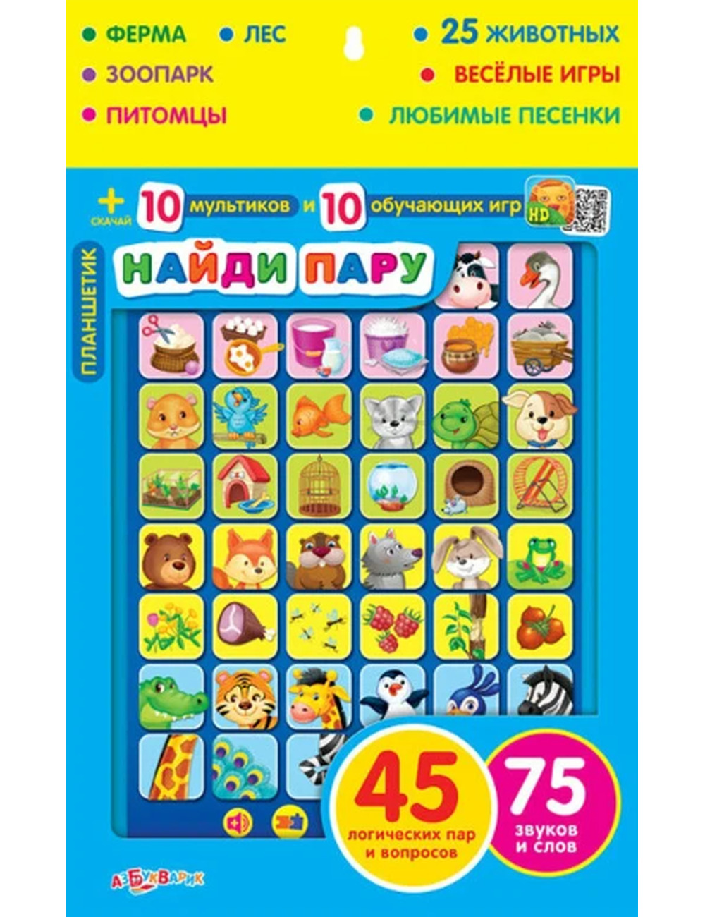 Азбукварик представляет новый обучающий планшетик для малышей с веселыми логическими играми «Найди пару» и «Чей это голос?». Знакомься с животными фермы, леса и зоопарка, угадывай их голоса! Ты узнаешь, что они едят, где живут и какую пользу приносят. Подбери пару к каждому животному!