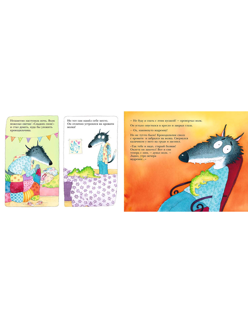 В домике с оранжевой, как морковка, крышей жили душа в душу овечка по имени Рагу и волк по имени Вок. Однажды вечером они нашли на дороге большое ничейное яйцо и принесли его домой. Вок хотел сделать из яйца омлет, но овечка ему не позволила. И правильно сделала, потому что из яйца вскоре вылупился крокодильчик, которого они назвали Омлет. Лесные звери сначала побаивались зеленого малыша, а потом полюбили его за доброту и веселый нрав. Правда, не все. Барсук твердил, что крокодил, когда вырастет, всех проглотит. Однажды после грозы их тихая речка разлилась, и бурный поток стал уносить утят от берега. Омлет устремился вдогонку, раскрыл пасть и захлопнул ее вместе с утятами. Неужели барсук был прав?