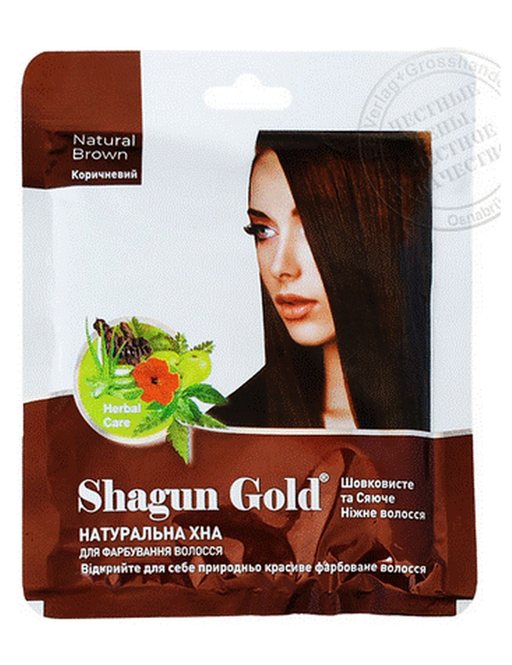 Натуральная Хна SHAGUN GOLD предназначена для стойкой и эффективной окраски волос в натуральный коричневый оттенок. Хна полностью окрашивает седину, дарит насыщенный и стойкий цвет, укрепляет и восстанавливает волосы от корней до кончиков, благодаря натуральным индийским растениям: амла, ритха, шикакай, брахми, туласи, алоэ вера, нем, джатаманси и входящие в состав гибискуса.