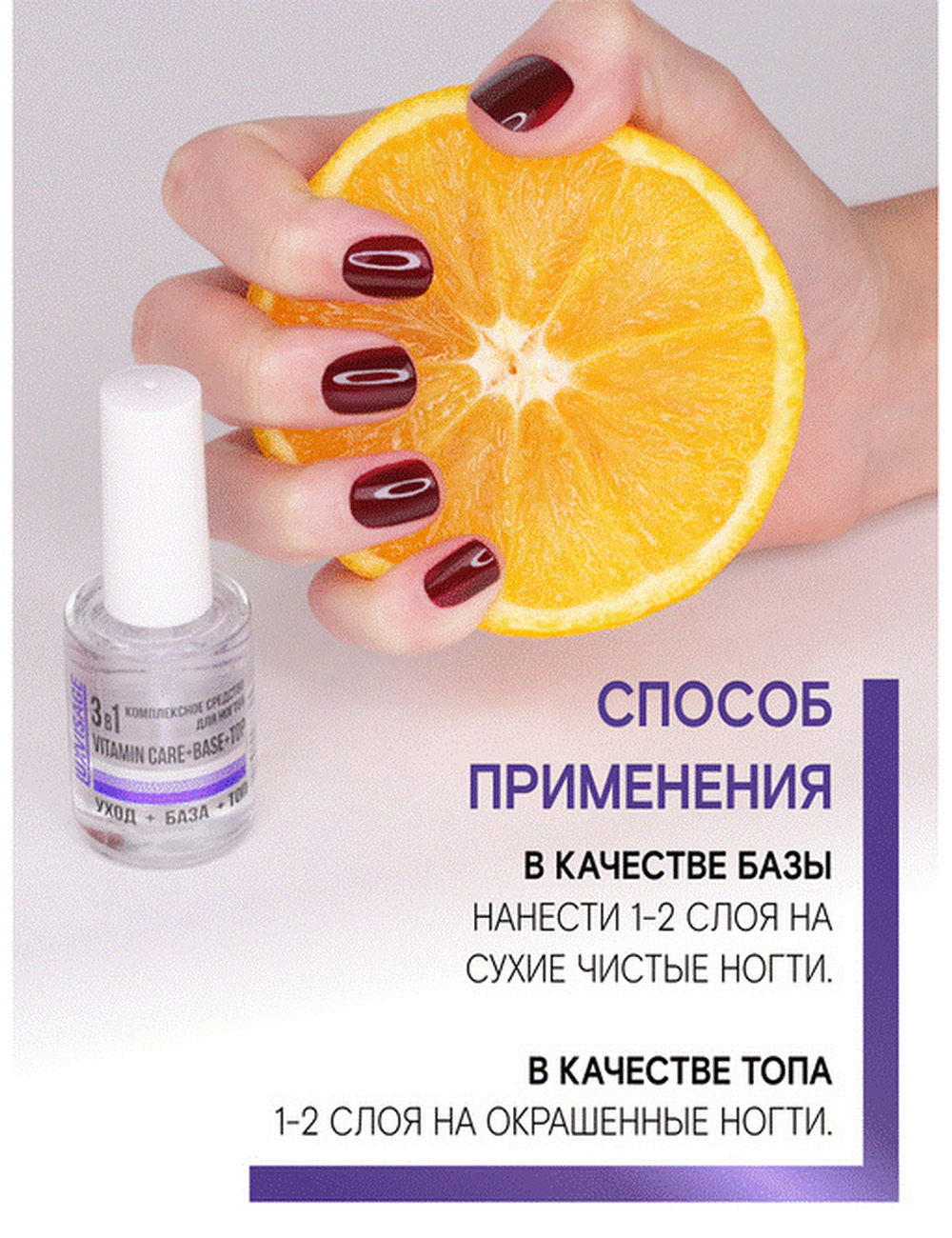 Cодержит витамин Е и комплекс аминокислот, которые способствуют укреплению и увлажнению ногтевой пластины.