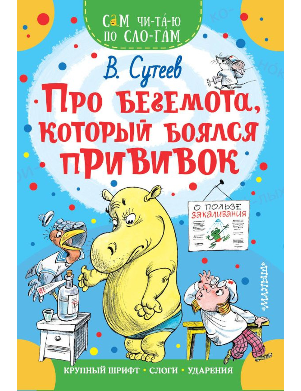 Покажите ему серию "Сам читаю по слогам". Это книжки небольшого формата, с большими буквами, и все слова разбиты на слоги с ударениями. В этой серии собраны лучшие произведения классиков детской литературы — С. Маршака, С. Михалкова, Э. Успенского, Г. Остера, В. Сутеева и других знаменитых писателей и поэтов. Каждую книжку маленькие мальчики и девочки смогут прочитать САМИ от начала и до конца, а потом будут гордо говорить: "Вот мои первые прочитанные книжки. Хочу читать ещё!" В этой книжке малышей ждёт бегемот и его друг Марабу. Помогите бегемоту не бояться прививок!