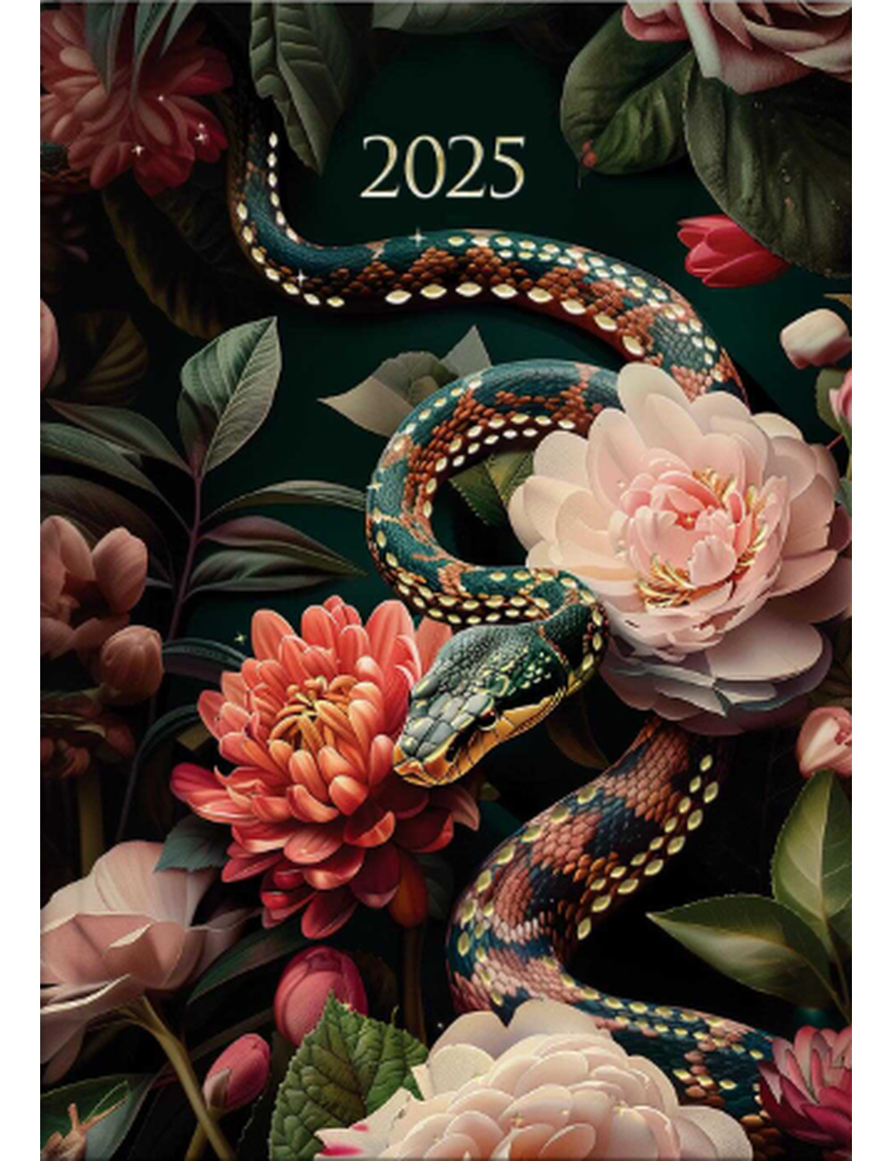 Ежедневник датированный 2025 арт. 68028 ЗМЕЯ В ЦВЕТАХ / А5, 145х205 мм, 160 л., твёрдый переплёт 7БЦ, полноцветная печать, матовая ламинация. Блок - белый офсет, 65 г/м², печать в одну краску, датированный.