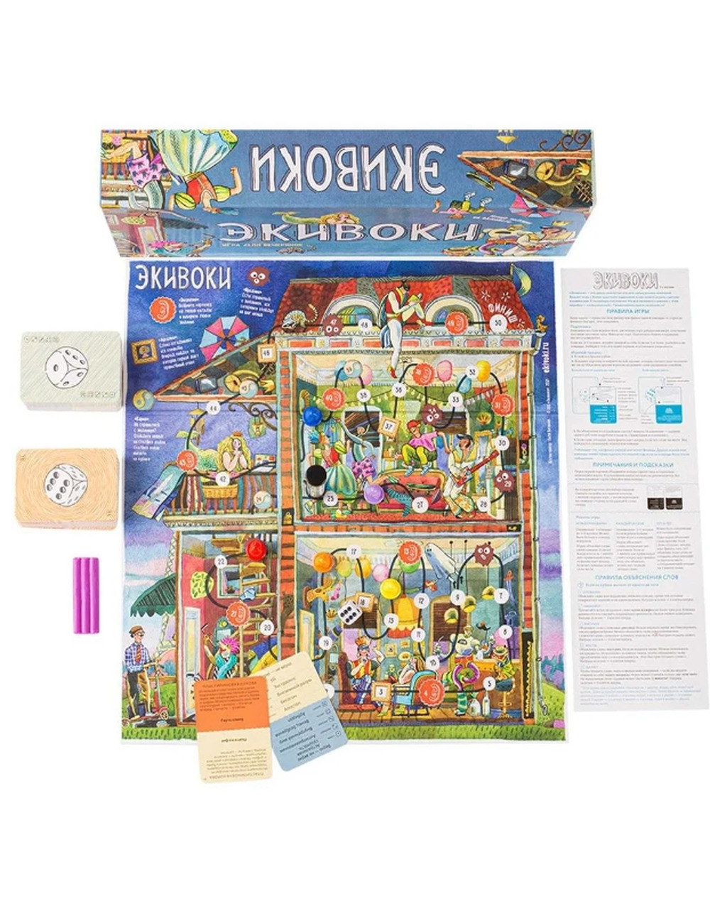 Уникальный коктейль из всевозможных импровизационных заданий, странных, смешных, редких и понятных только нашим соотечественникам слов и словосочетаний (типа «монах в синих штанах» или «хрущевка») и забавной авторской графики, смешанный на одном красочном игровом поле и разбавленный разноцветными фигурками пингвинов вместо кубиков льда – вот, что такое Экивоки.