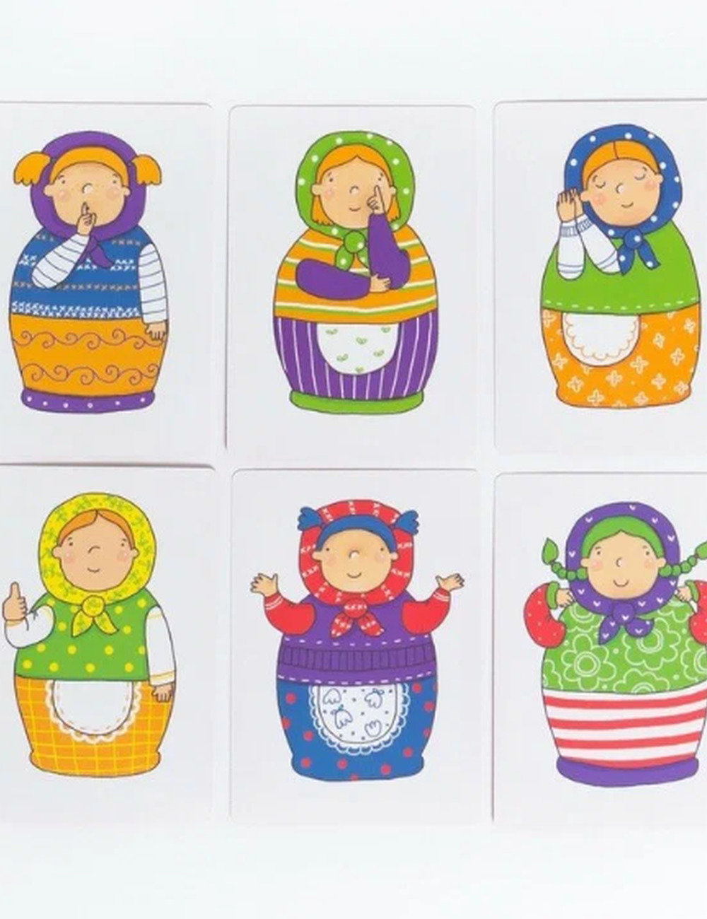 И жесты у них у всех разные: кто руками всплеснул, кто – за голову схватился. Игроки наперегонки ищут нужную матрёшку, чтобы повторить её жест. Кто успел первым – получает от ведущего разыгранную карточку.