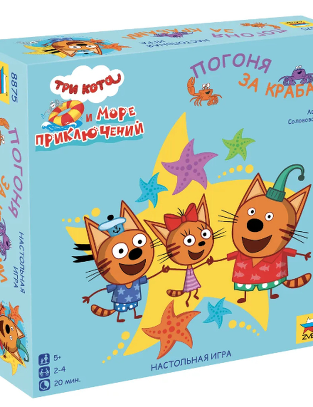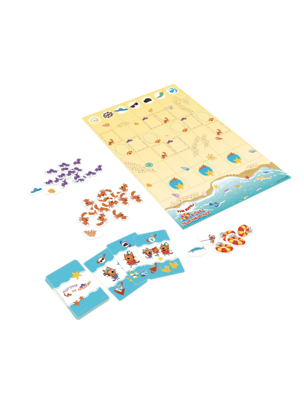 Наконец-то Папе, Маме и котятам удалось выбраться на отдых к морю! Котята очень хотели на пляж, где можно искупаться и найти ракушки. Но, похоже собранная коллекция приглянулась местным крабам. Котята дружно бросились за крабами, чтобы спасти найденные сокровища!Игровой процесс : Игрокам предстоит выбирать карточку и разыгрывать все, что в ней написано – двигать крабов, размещать их и ловить котятами! Любой игрок может походить любым котёнком. Перехитри других игроков и поймай больше всех крабов! Состав игры: Игровое поле; Карточки – 36 шт.; Жетоны крабов – 60 шт.; Жетоны помощи – 6 шт.; Фишки котят – 3 шт.; Правила игры. Данная игра отлично подойдет в качестве подарка на любой праздник: подарок на Новый год, новогодний подарок, подарок для девочки, подарок для мальчика, подарок на новый год детям, для девочек подарок, подарок мальчику, подарок на день рождения, подарок ребенку на новый год.