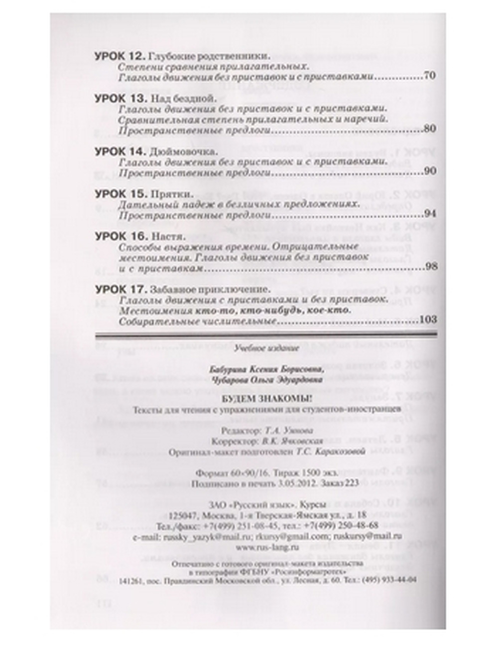 «Книга для чтения» разбита на уроки, каждый урок включает в себя один текст. В подзаголовке урока указывается грамматика, которую рекомендуется усвоить или повторить перед чтением текста. Грамматические темы пособия соответствуют программе по русскому языку 2-го семестра первого года обучения. Таким образом, пособие помогает студентам подготовиться к сдаче экзамена по русскому языку в объеме Государственного стандарта 1-го сертификационного уровня.