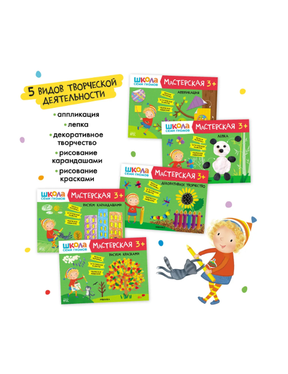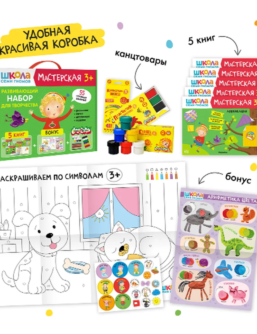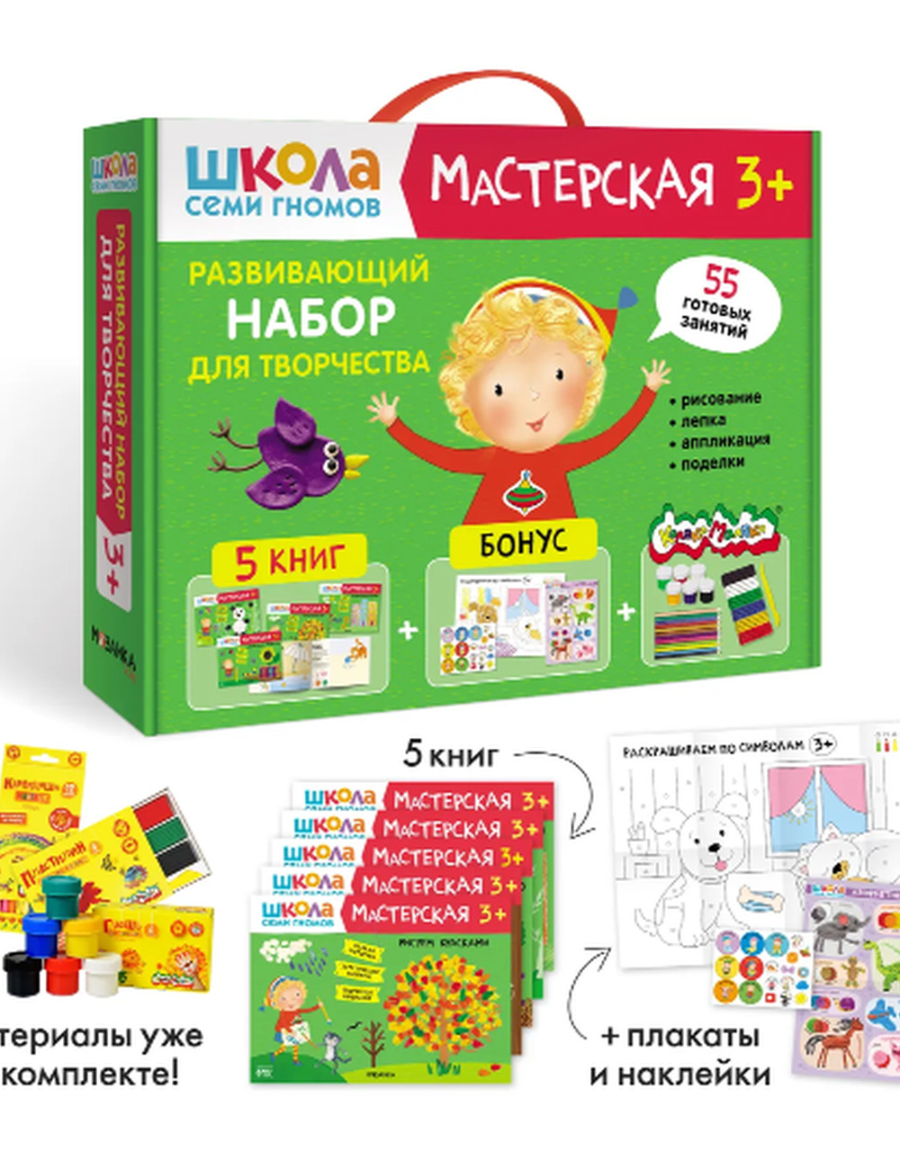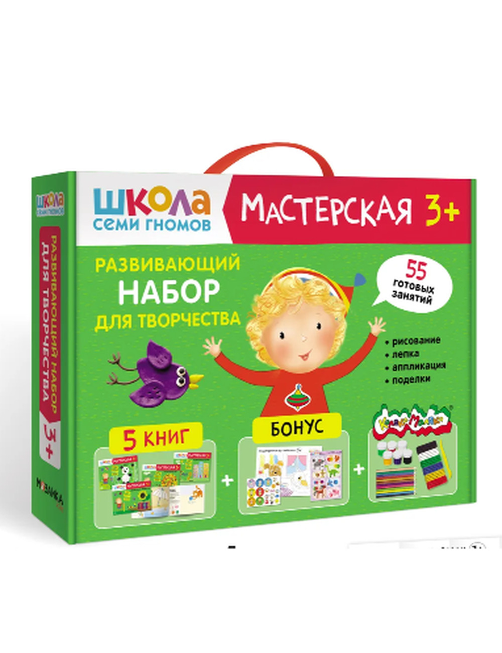 "Школа Семи Гномов. Мастерская 3+" - развивающий набор, который поможет легко организовать веселые и полезные занятия творчеством с детьми от 3 до 4 лет. Это 55 готовых занятий, которые помогут ребенку освоить все основные виды творческой деятельности: аппликацию, рисование красками и карандашами, лепку и создание поделок из доступных материалов.