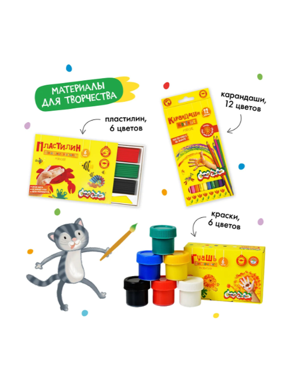 Канцелярские товары: пластилин (6 цветов), карандаши (12 цветов), краски (гуашь, 6 цветов).