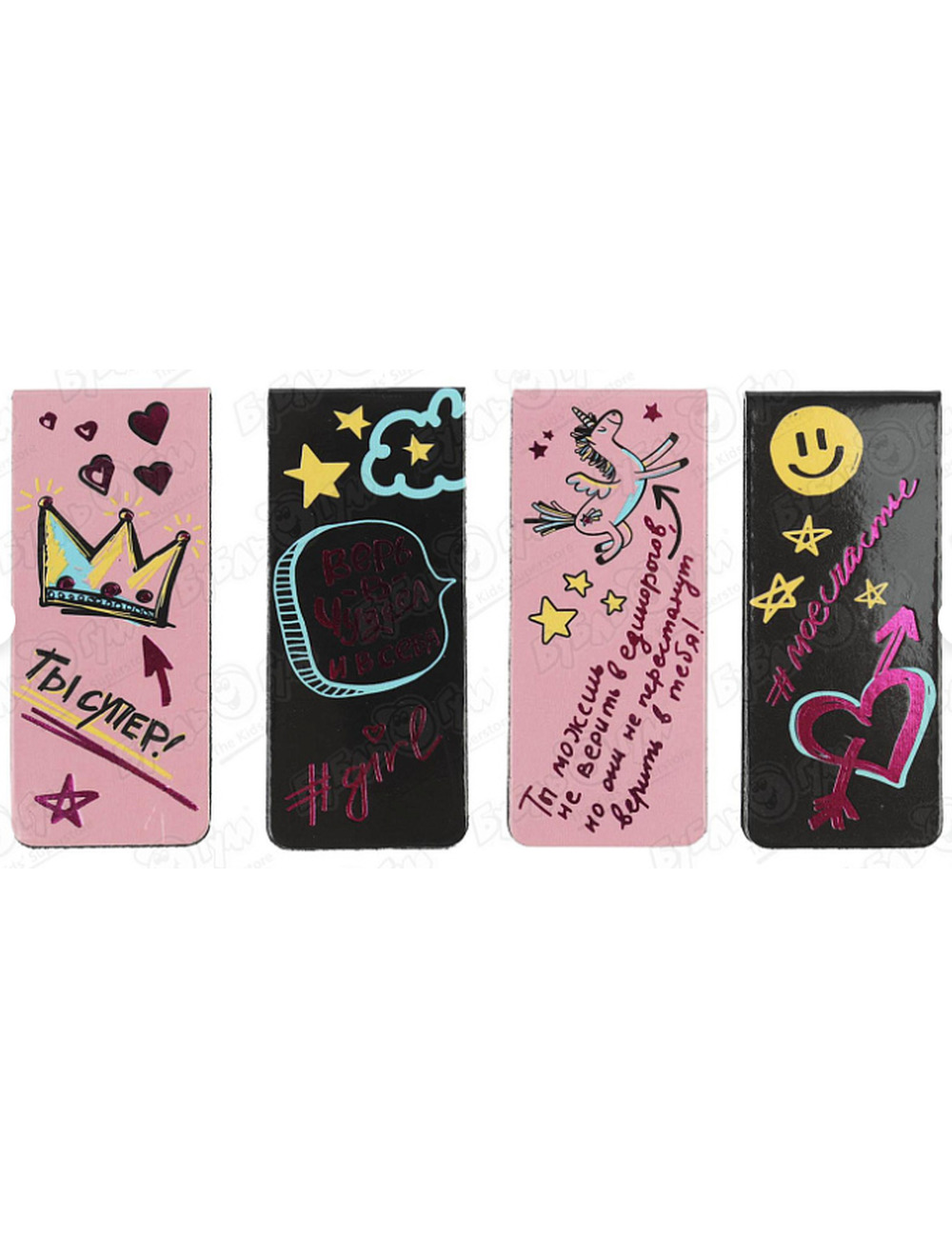 Магнитные закладки для книг «Ты супер!» — удобный и стильный аксессуар для детей и взрослых. В наборе 4 закладки, каждая из которых имеет уникальный дизайн с яркими надписями и рисунками. Выполненные в модной цветовой гамме с элементами розового, черного и голубого, закладки украшают книги и тетради, привнося радость в чтение и обучение.