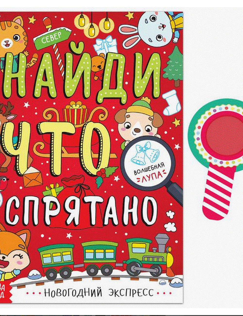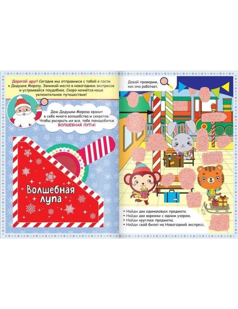 В наборе детская книжка и необычная лупа с ручкой. Любознательный непоседа рассматривает страницы со специальным покрытием и с помощью игрушки находит ответы на разные вопросы. Он старается отыскать две одинаковые фигурки на елке, узнает, что осталось в мешке доброго волшебника, кто из зверят получил сладкие подарки, какой сюрприз вручили псу Шарику и что спрятано под новогодним деревом.