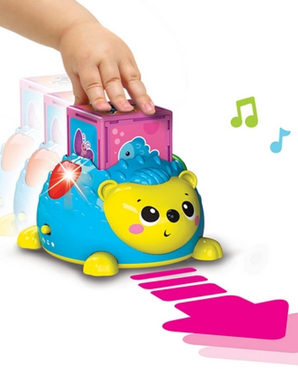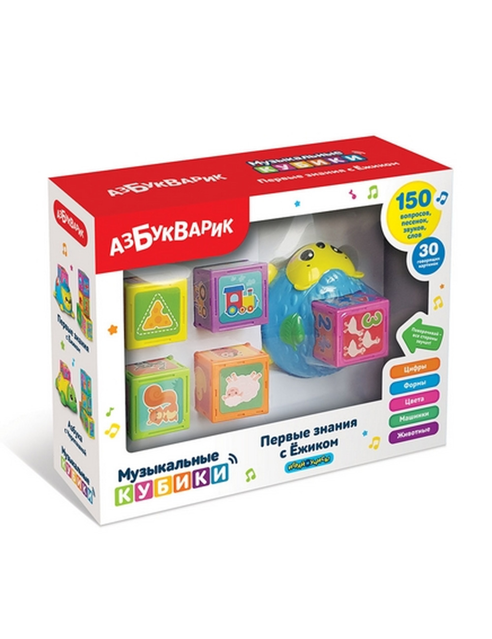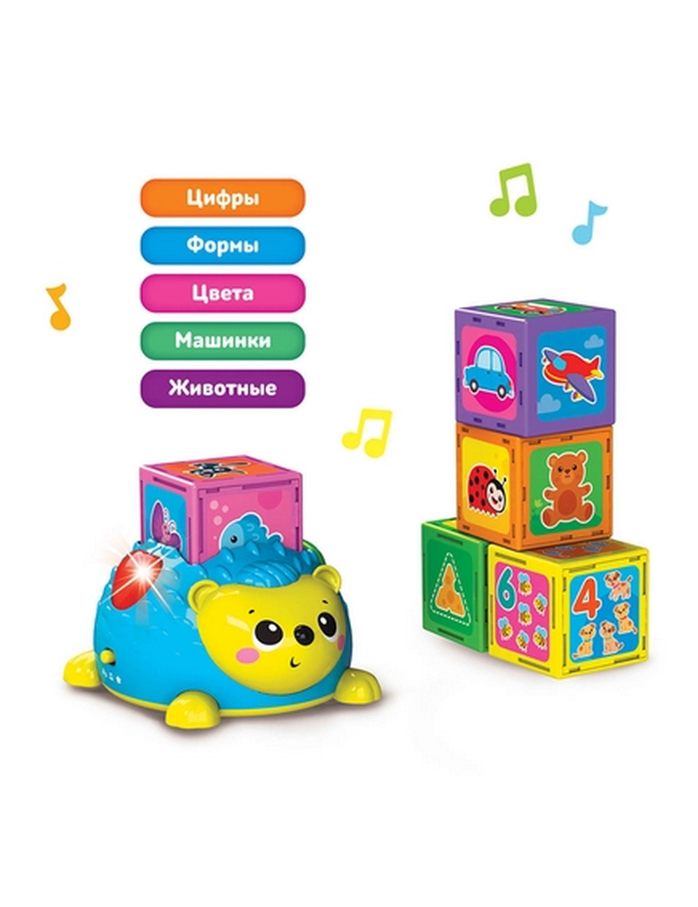 Умный ежик при помощи 5 обучающих кубиков поможет малышу выучить цифры, формы и цвета, познакомиться с машинками и животными! Нужно просто вставить кубик и нажать!