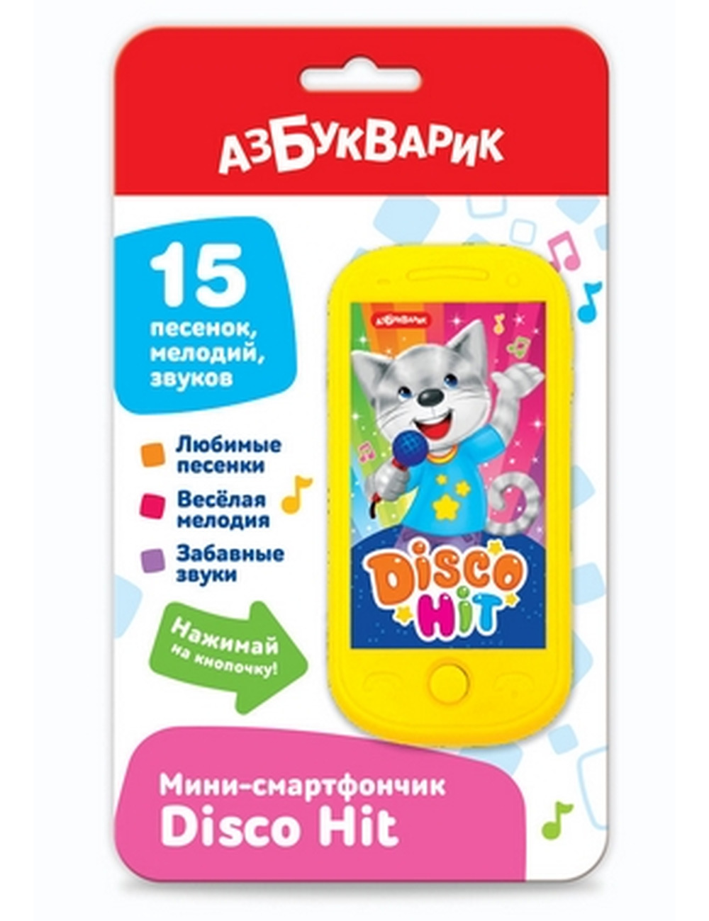 Игрушечный телефончик со звуком «Disco Hit» от бренда «Азбукварик» понравится каждому малышу. Он современный и яркий, с веселым котенком на дисплее. Как только малыш нажмет на кнопочку, телефон сыграет 15 разных мелодий, песен, звуков. Вместе с музыкальной игрушкой малыш выучит веселые детские хиты: «Если весело живётся, делай так», «Котёнок-веселушка», «У друзей нет выходных», «Пляшут весело детишки», «Что такое праздник?» и другие. Мини смартфон поможет ребенку развить память и музыкальный слух.