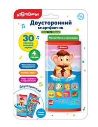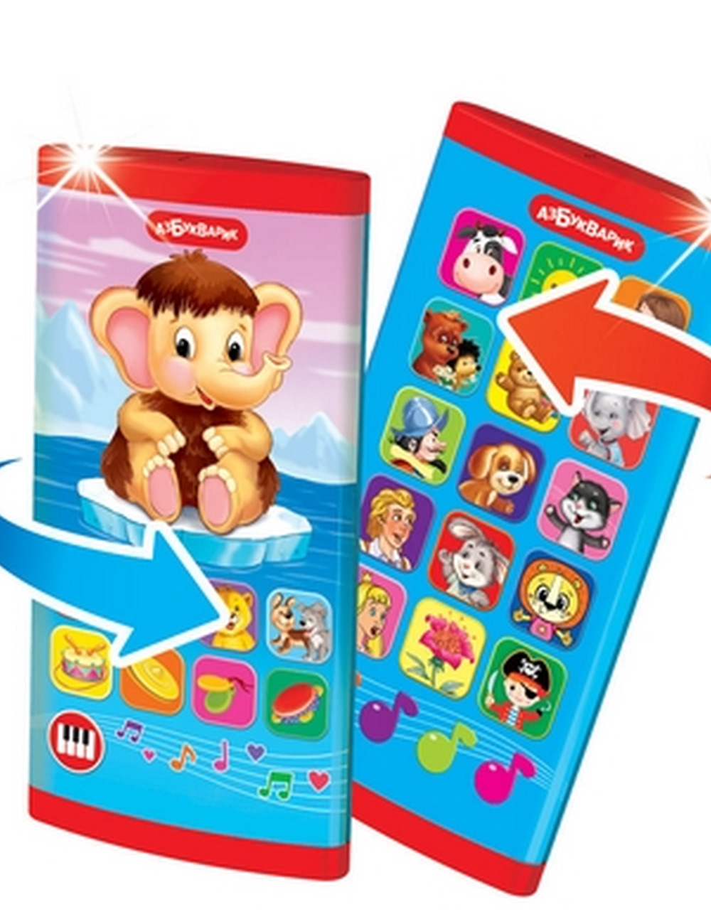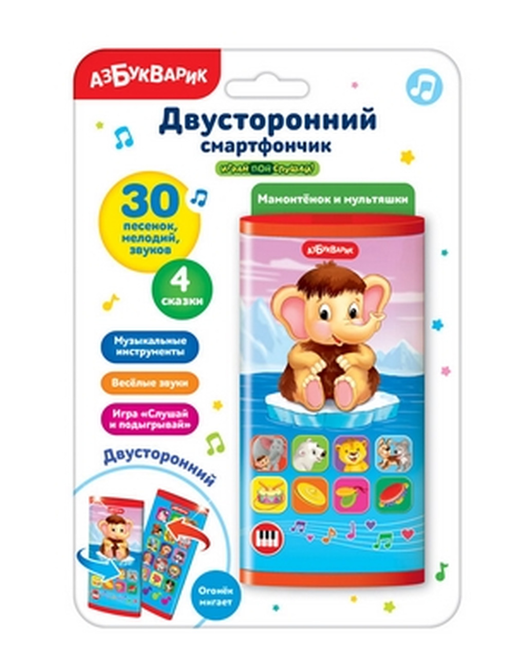 Двусторонний смартфончик «Мамонтёнок и мультяшки» – прекрасная игрушка для малыша! Играть с этим смартфончиком вдвойне интересно – ведь теперь нажимать на звуковые кнопочки можно с двух сторон! Ребенок будет надолго занят своим гаджетом: смартфончик расскажет ему 4 мультсказки («Мама для Мамонтенка», «Умка», «Как Львёнок научился дружить», «Два щенка») и развеселит кроху любимыми песенками и мелодиями («Песенка Мамонтёнка», «Барбарики», «Облака», «Где-то в жаркой Африке», «Песня охраны», «Звёзды континентов», «Расскажи, Снегурочка»). Порадует ребенка и интересный режим «Подыгрывание на музыкальных инструментах», благодаря которому юный музыкант сможет добавлять новые звуки и слушать собственные композиции.