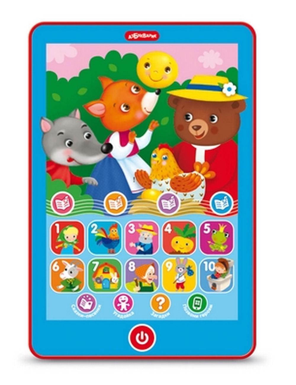 Нажимая на кнопочки и рассматривая яркие картинки, ребенок познакомится со сказочными героями, выучит цифры, послушает песенки-сказки и веселые фразы. Всего в планшетике собрано 6 песенок-сказок («Волк и семеро козлят», «Колобок», «Курочка Ряба», «Три медведя», «Репка», «Теремок»), 3 обучающие и развлекательные игры («Угадайка», «Волшебные загадки», «Позвони сказочным героям»), множество вопросов, загадок, веселых голосов и звуков.