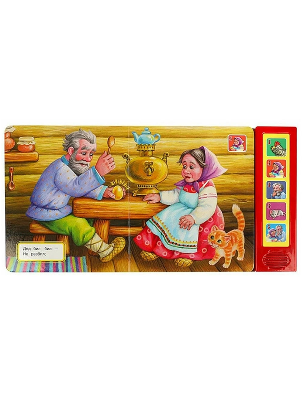 Ребёнок с удовольствием будет листать плотные страницы, рассматривать яркие картинки, вместе с родителями читать интересную сказку и, конечно, нажимать на кнопки и слушать весёлые песенки. Малыш легко освоит включение звука: по нажатию на кнопку песенка включится, при втором нажатии выключится. Благодаря компактному размеру книгу удобно взять с собой в дорогу.
