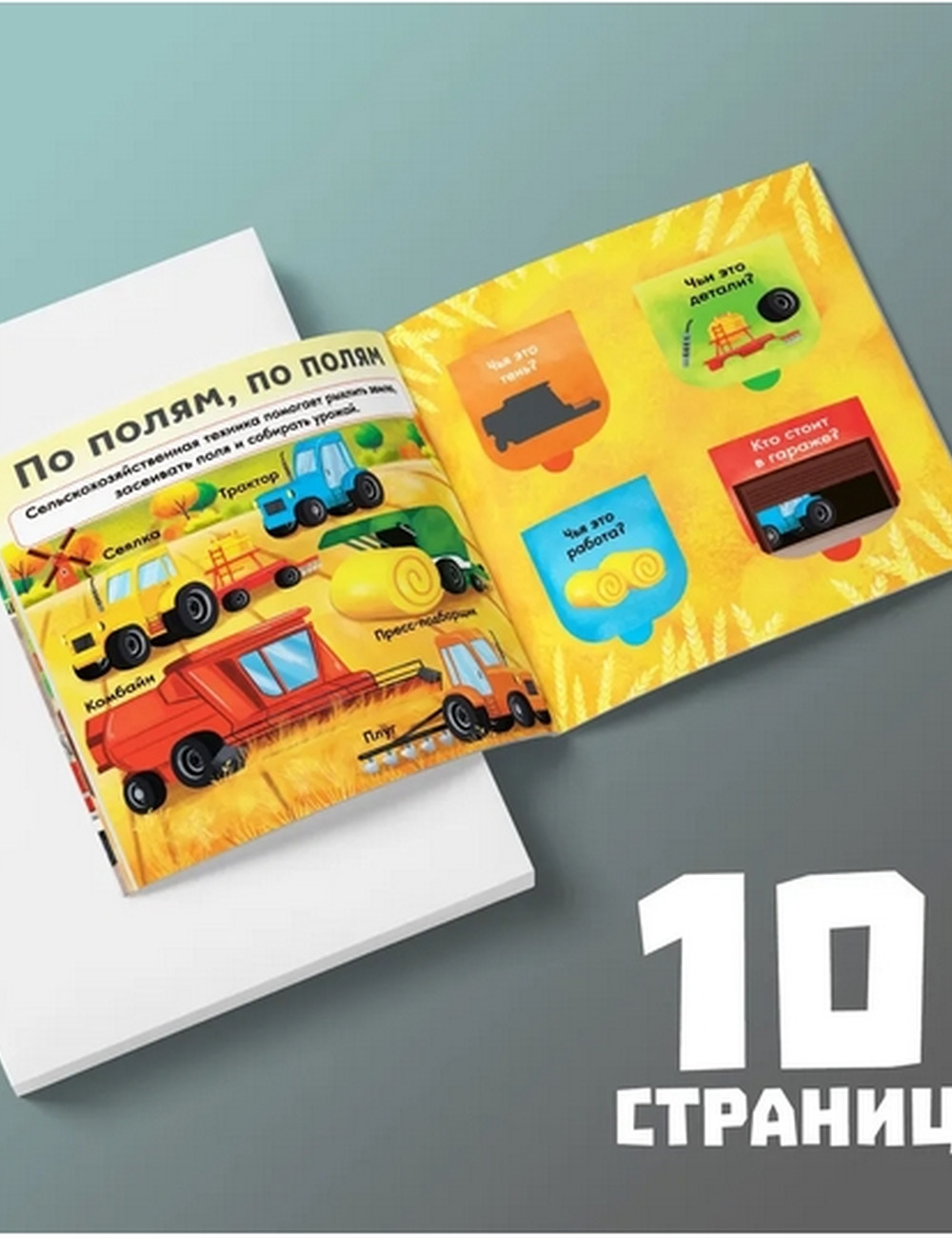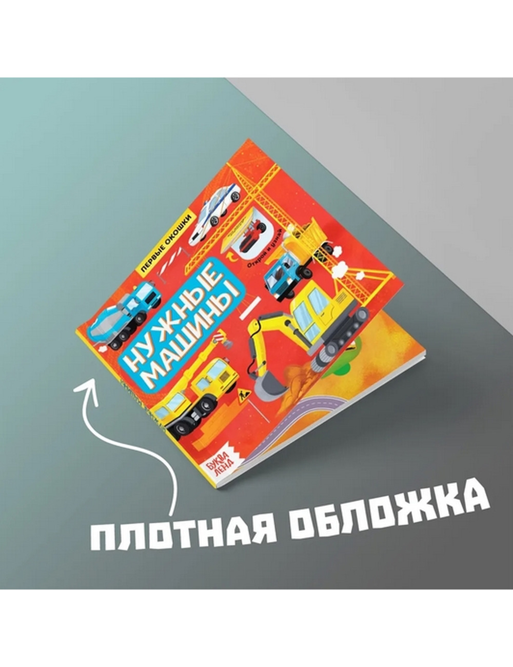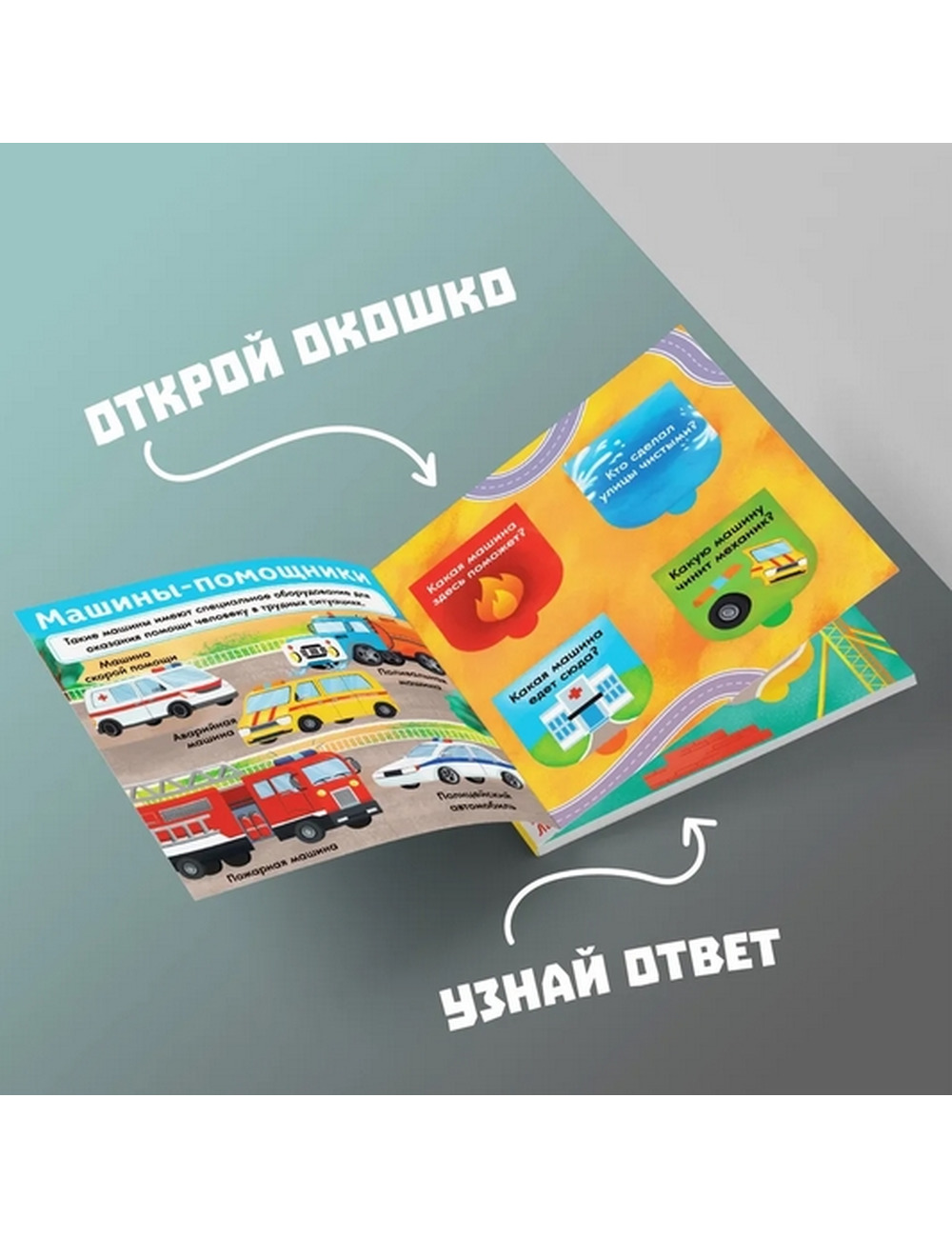Книга сделана из плотного картона, поэтому прослужит долго. Внутри ребёнок найдёт 16 окошек с яркими изображениями машинок. Также в книжке есть интересные логические задания.
