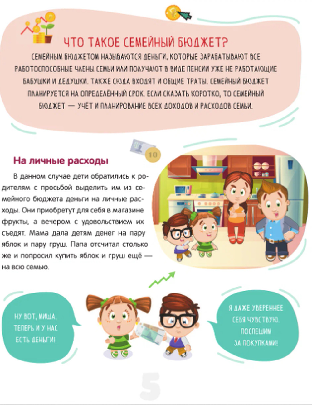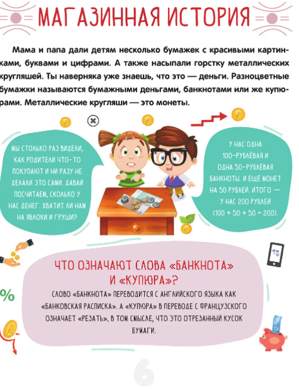 Дорогие родители! Если ваш ребёнок задаёт очень много вопросов, среди которых нередко встречаются достаточно щекотливые, не пытайтесь уйти от ответа. В таких случаях, даже когда ответить бывает очень сложно, обязательно поговорите с ним. Лучше научить своего ребёнка самим, чем это сделают другие — друзья или вообще посторонние люди. Ведь вы хорошо знаете своё чадо и понимаете, что, когда и как ему рассказать. Более того — при этом вы сохраните доверительные отношения, что тоже, несомненно, важно. Тема денег, конечно, не запретная, но очень деликатная, здесь нужно соблюдать осторожность, чтобы впопыхах не направить ребёнка по ложному пути. В этой книге мы постарались раскрыть её максимально доступно, легко и интересно.