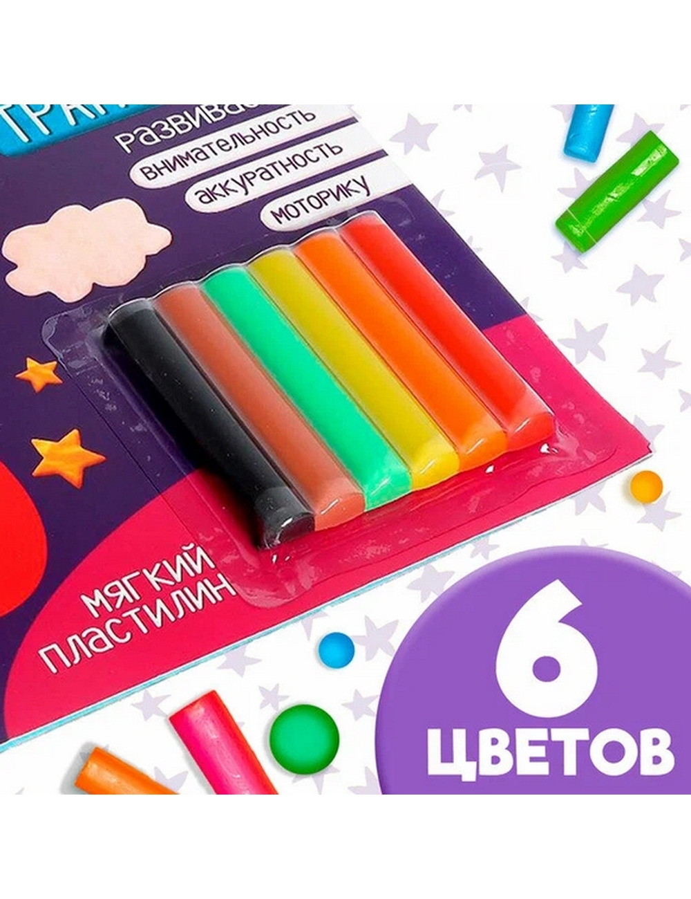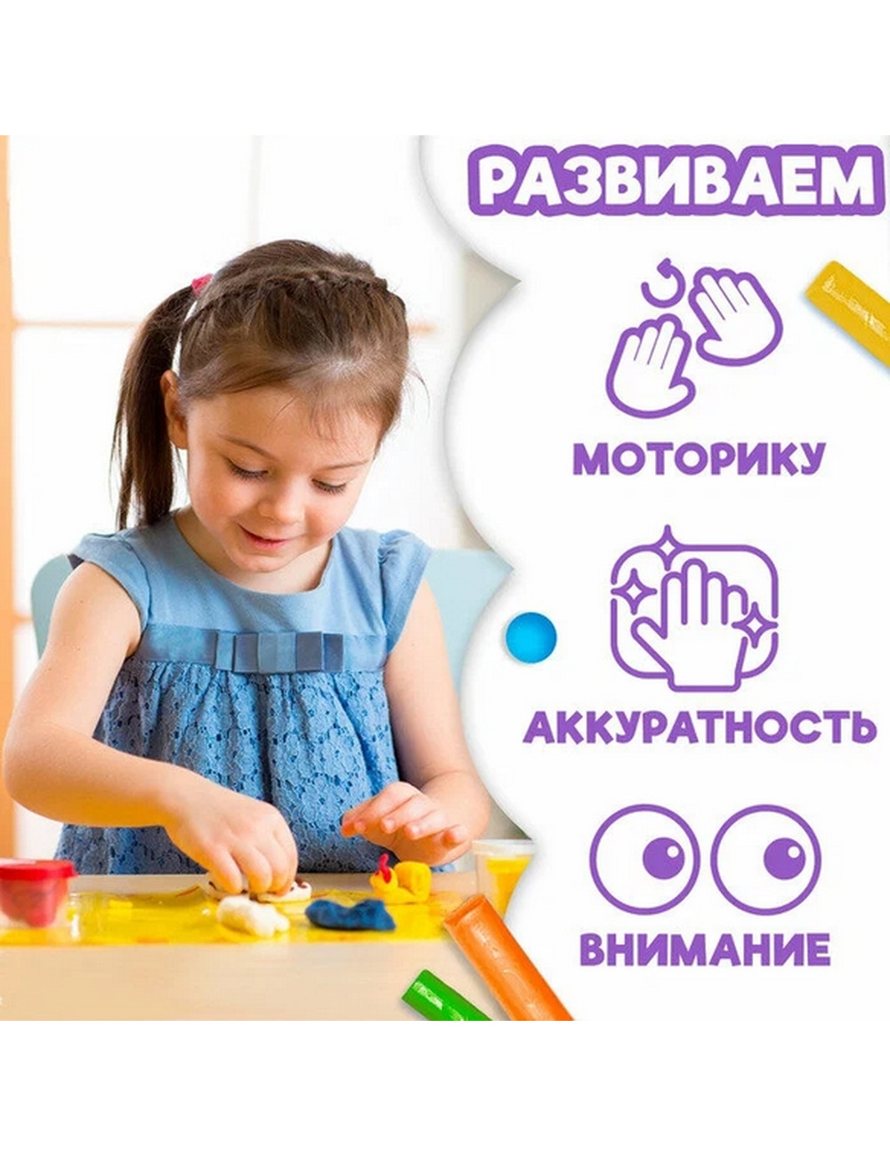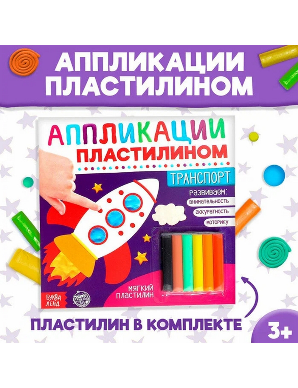В комплекте есть разноцветный мягкий пластилин, поэтому можно сразу приступать к творческим занятиям с малышами.