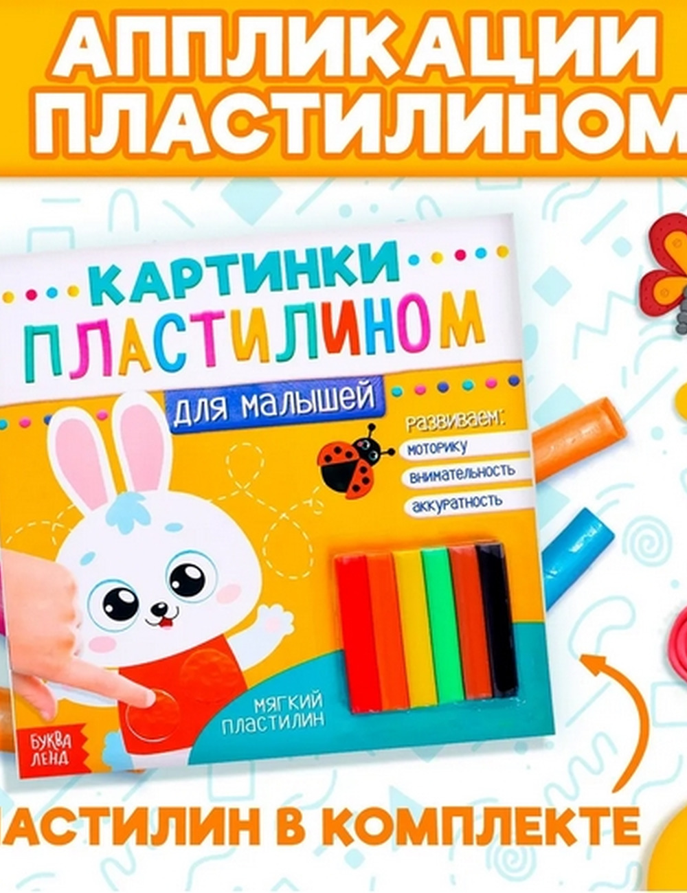 Книга для аппликации пластилином направлена на развитие моторики, внимательности и аккуратности у малышей.