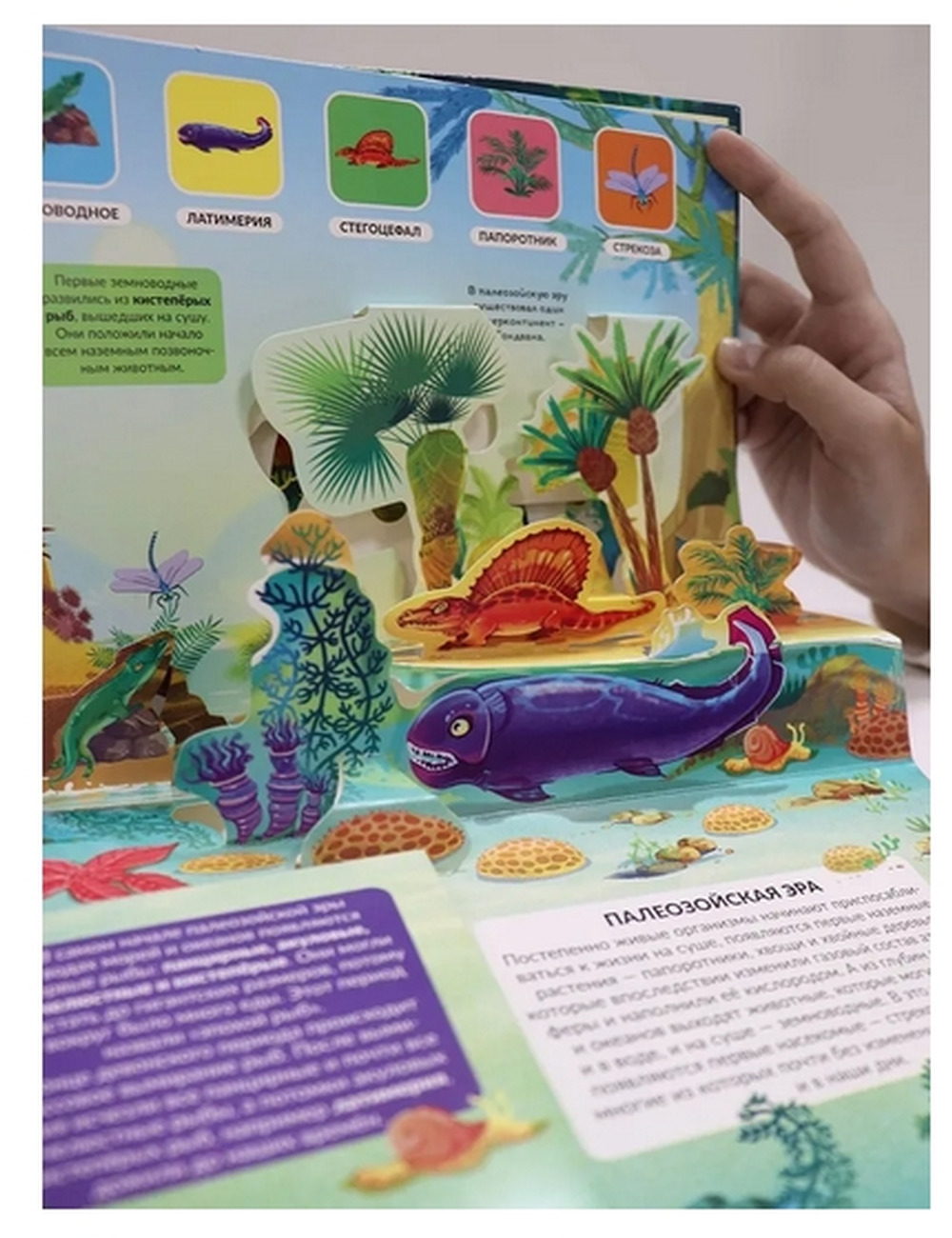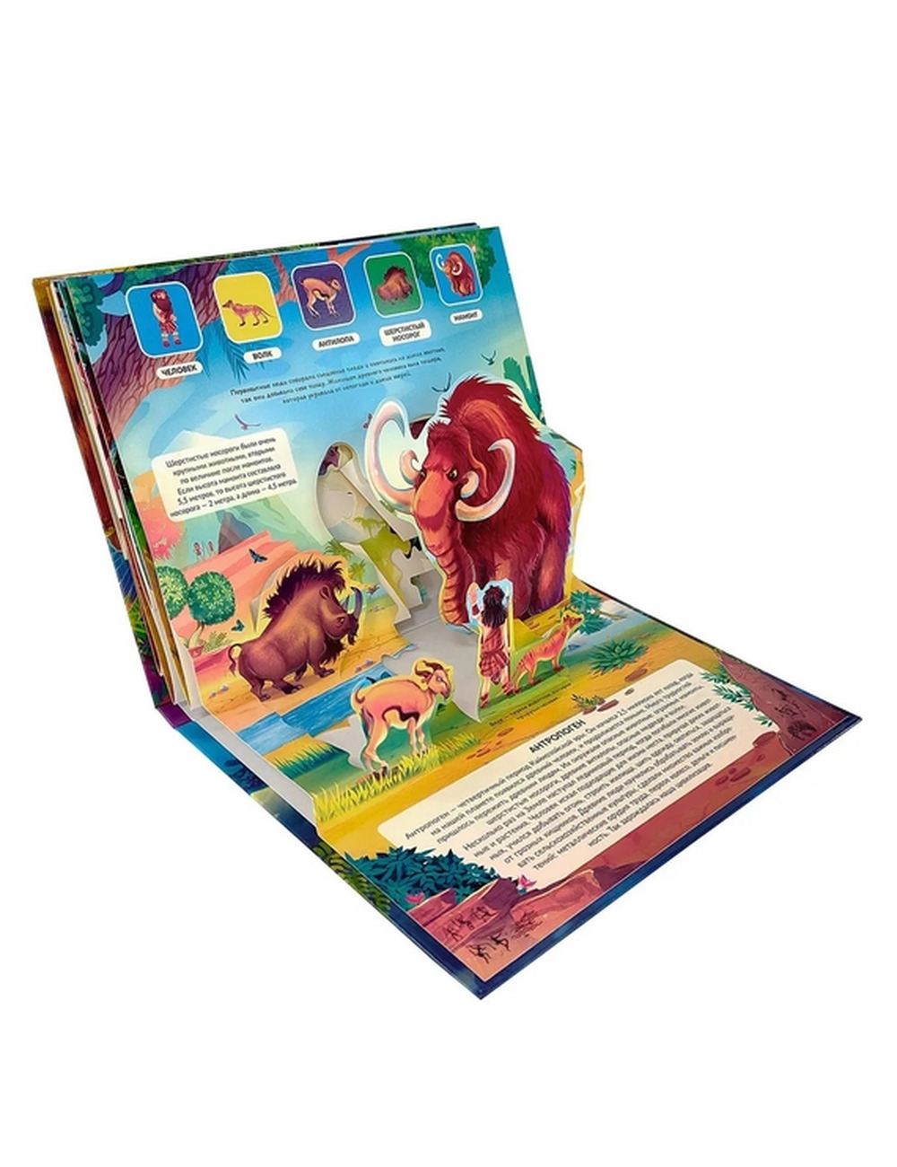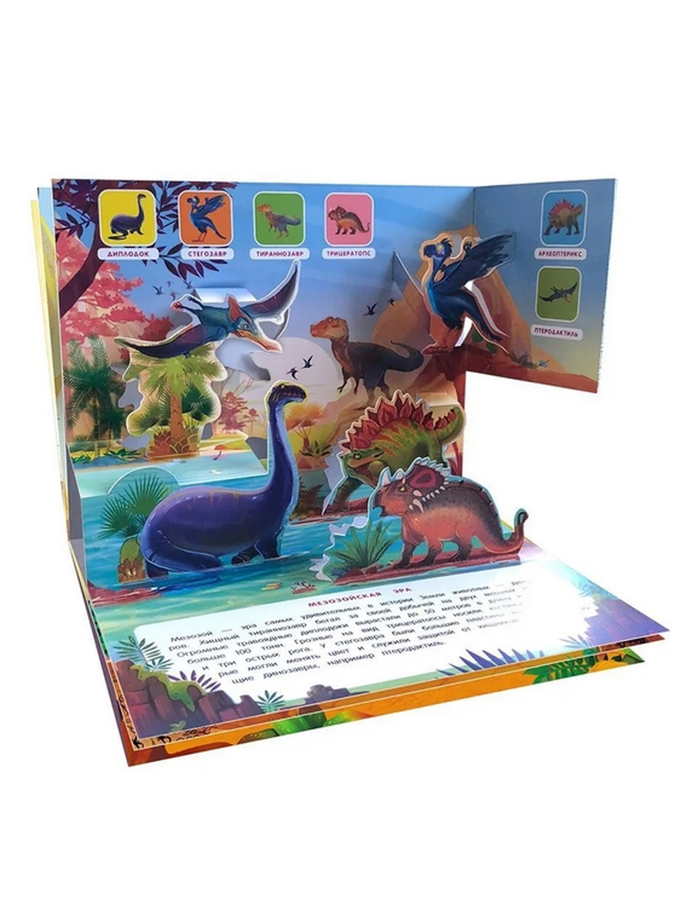Яркая энциклопедия "Динозавры" в формате книжки-панорамки с невероятными объемными иллюстрациями. 3D развороты создают ощущение дополненной реальности и настоящего путешествия в мир изобретений. На каждом развороте есть откидной клапан-сюрприз, заглянув под который малыш увидит интересный факт или изображение. Наличие объемных и открывающихся элементов развивает мелкую моторику и пространственное мышление ребенка. Размер обложки: 26х20 см, 5 объемных разворотов. Порадуйте своего ребенка увлекательной энциклопедией-панорамкой с яркими, объемными иллюстрациями!