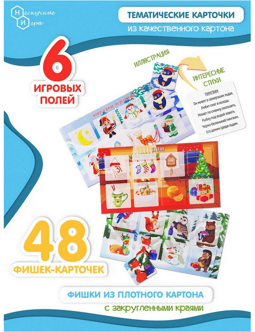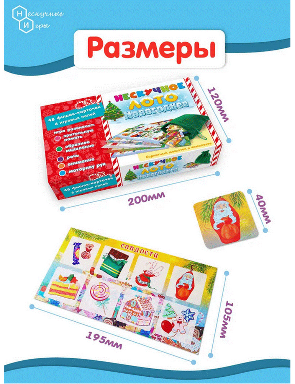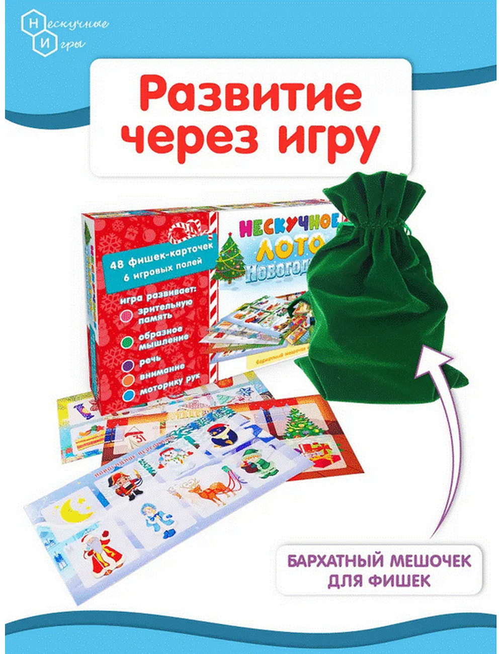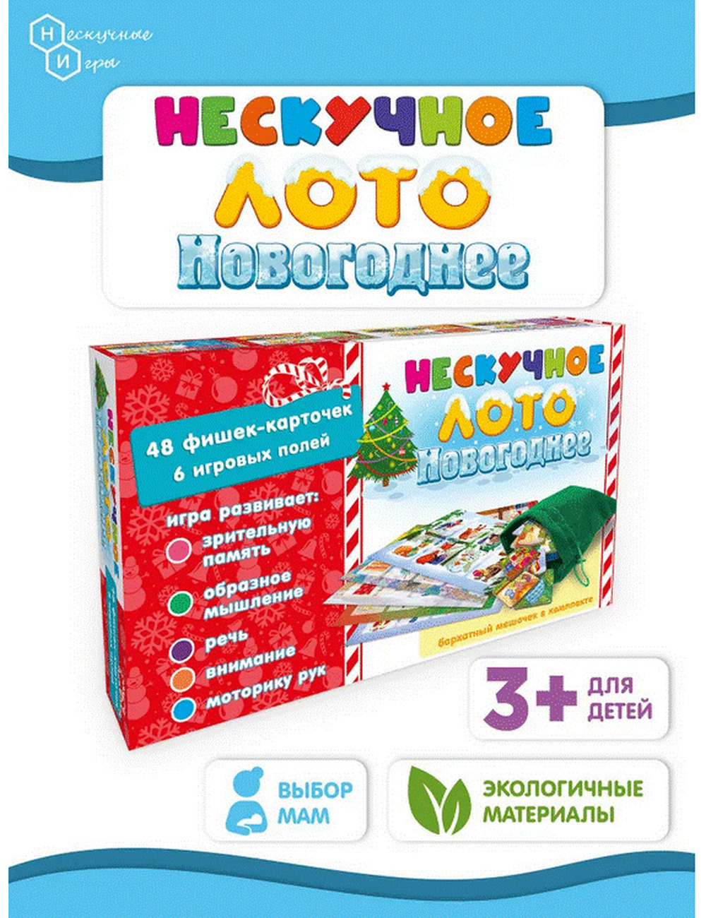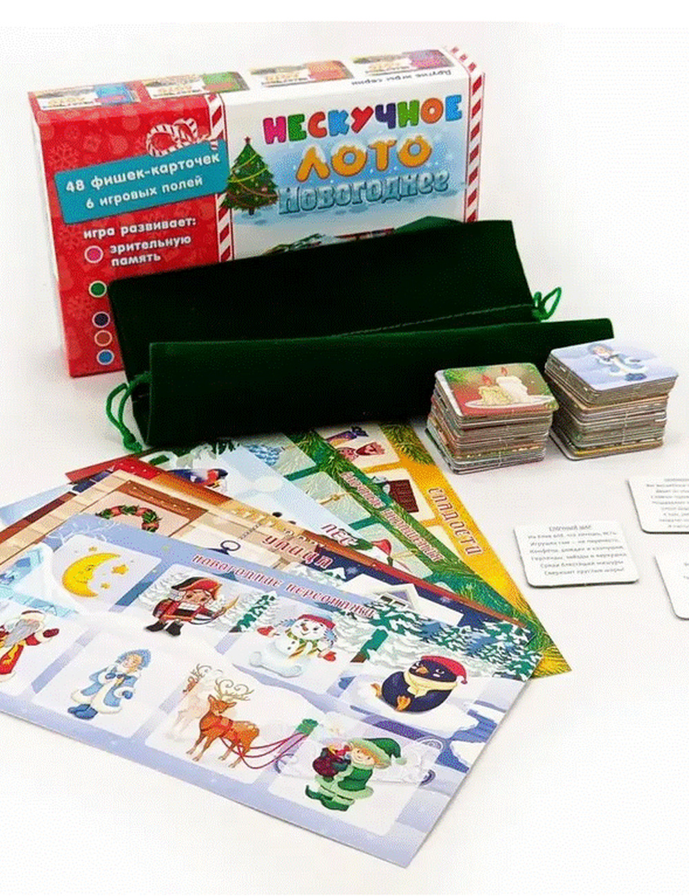 Детское лото представляет собой набор разделенных на квадраты полей-карточек с изображениями различных новогодних персонажей, елочных украшений, сладостей, лесных животных, украшений для дома и улицы, и фишек-карточек, совпадающих с изображениями на полях. Игрокам раздаются игровые поля по видам новогодних атрибутов. Ведущий (это может быть самый младший игрок, который одновременно может быть и участником), вытаскивает из специального мешочка фишку и громко называет изображенный на картинке предмет или животное. Кто нашел на своем поле соответствующее изображение, забирает фишку себе. При этом, в процессе игры ребенок может рассказать маленький стишок, который указан на обороте фишки-карточки. Так продолжается до тех пор, пока кто-либо из участников не закроет фишками все игровое поле. Он и является победителем. Можно называть изображенный внутри буквы предмет или героя, для усложнения игры и веселья. С помощью карточек цифр и математических знаков можно решать простейшие задачи. Лото умножает знания малыша, развивает его внимание, память, мышление, речь, расширяет кругозор и словарный запас. В нашем Лото 48 двухсторонних фишек изготовленных из плотного картона, которые удобно лежат в руке. Мешочек выполнен из бархатной ткани и похож на мешок Деда мороза с подарками. Все картинки объединены по тематике, и на задней стороне карточек-фишек есть новогодние стихотворения и можно не только играть в классическое лото, но и разучить с ребенком эти четверостишья, которые привнесут в игру атмосферу этого замечательного праздника. Вам останется только нарядить елку и поставить мандарины на стол! Счастливого Нового года!