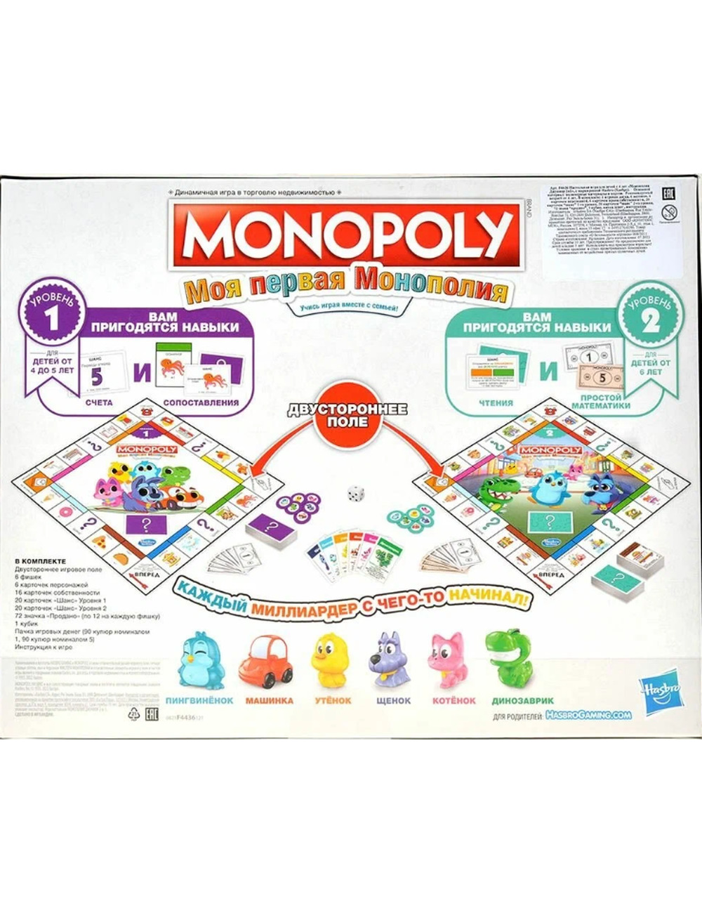Познавательная и интересная классическая настольная игра “Моя первая Монополия” (Монополия Джуниор от Хасбро) предлагает забавные обучающие инструменты для приятного времяпрепровождения в кругу семьи. Monopoly джуниор от Hasbro – это лучшая настольная игра для развития, направленная на повышение дидактических и интеллектуальных навыков мальчиков и девочек. Веселая развивающая игра прекрасно подойдет для семейного вечера или для хорошей компании друзей. Двусторонняя игровая доска предусматривает 2 уровня, из которых вы можете выбрать наиболее подходящий. Одна сторона посвящена подсчету и сопоставлению, рекомендуется для детей от 4 до 5 лет. Переверните доску и перейдите к продвинутой игре с чтением и простой математикой для детей от 6 лет. На каждом уровне используются отдельные наборы денег и карточек, а также наборы правил. Этой настольной игрой заинтересуются как взрослые, так и дети. Настольная игра Монополия джуниор от Хасбро сделает любой семейный вечер! Взрослые и дети с удовольствием будут играть в monopoly джуниор от Hasbro. Эта простая игра с яркими карточками и кубиком заинтересует даже начинающих и станет первой любимой игрой для мылышей.