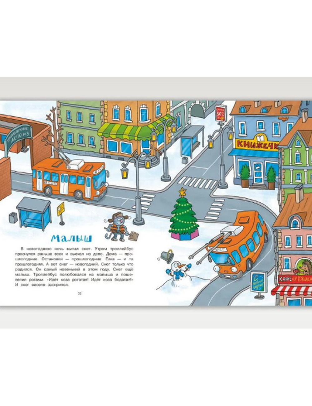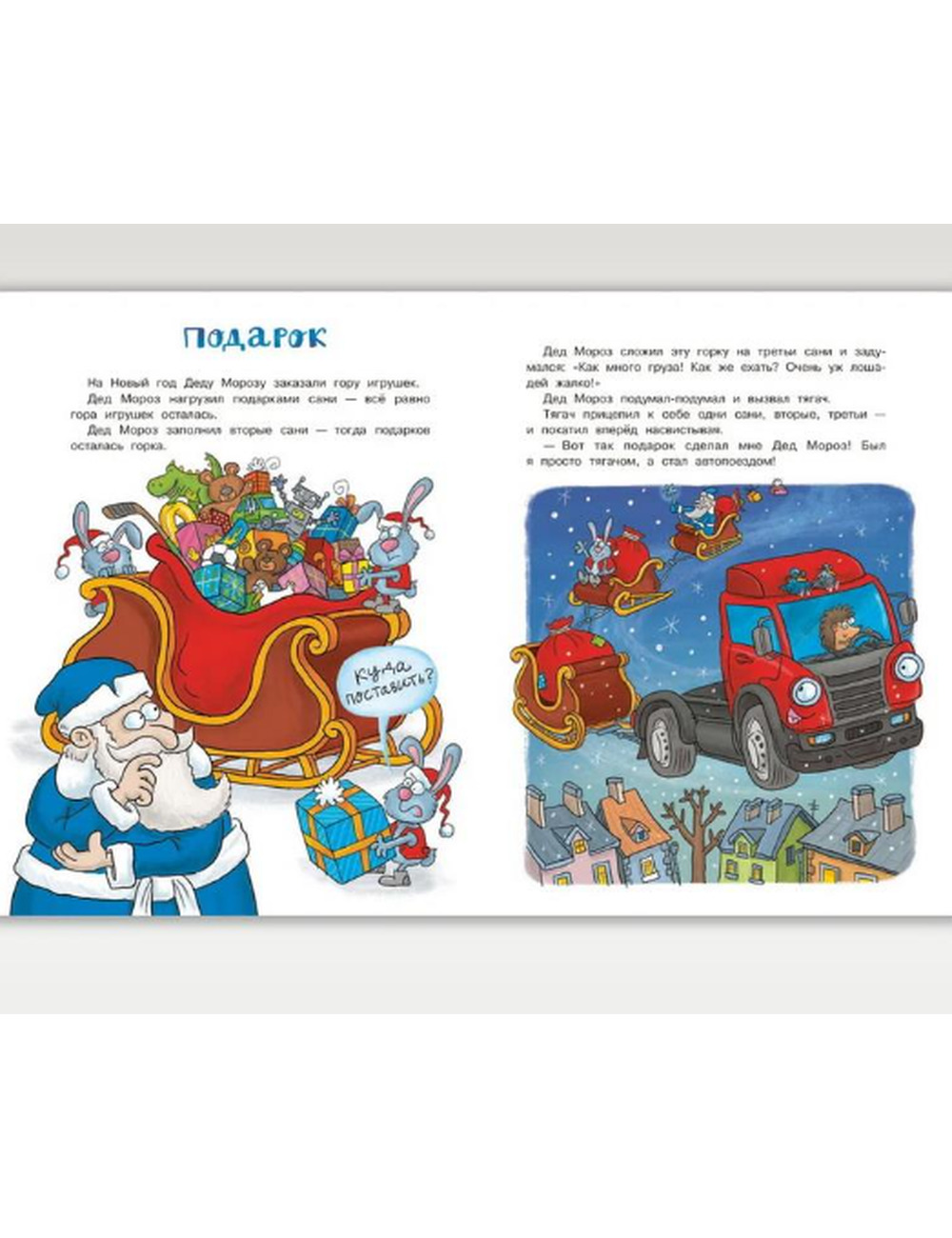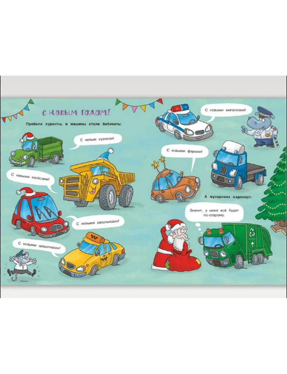 Встречают ли машинки Новый год? Конечно! Почтовая машина возит письма Деду Морозу, автокран украшает елку, а тягач помогает развезти гору подарков. Впереди зимние каникулы — а значит, утренник, маскарад и даже дискотека! Машинки наряжаются в мишуру и — на старт, внимание, марш! Кто быстрее доедет до Нового года?