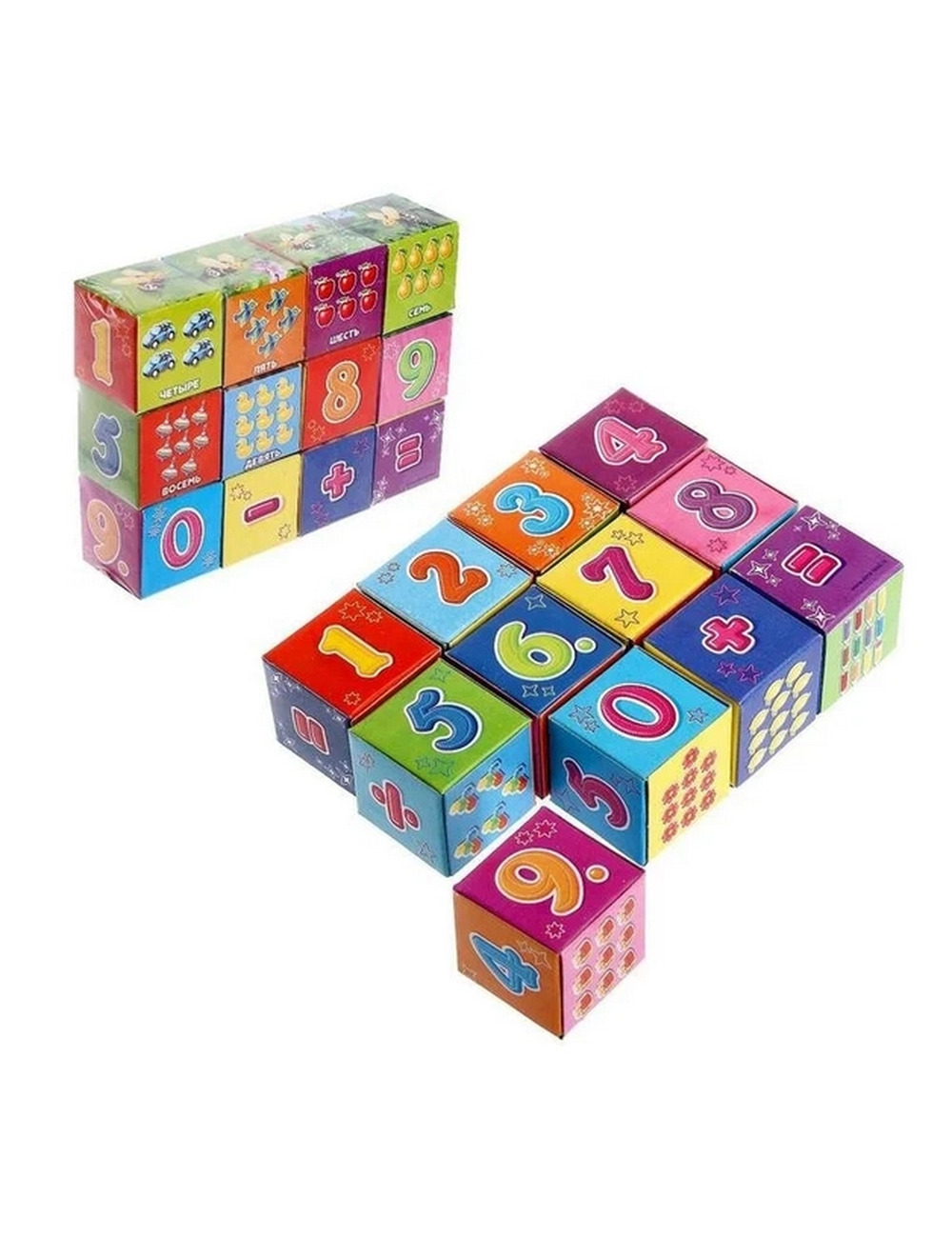 А как только малыш начнёт хорошо различать цифры, вы сможете составлять с кубиками математические примеры. На гранях есть знаки «+», «–», «=» и так далее. Придумывайте примеры сами, делайте первые шаги в подготовке к школе!
