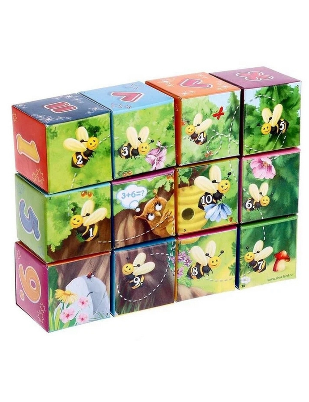 На кубиках вы найдёте яркие цифры, математические знаки и даже целую картинку-головоломку. Выберите цифру для изучения и найдите среди кубиков картинку с нужным количеством предметов. Например, для цифры 4 парой станет кубик с 4-мя клубничками.