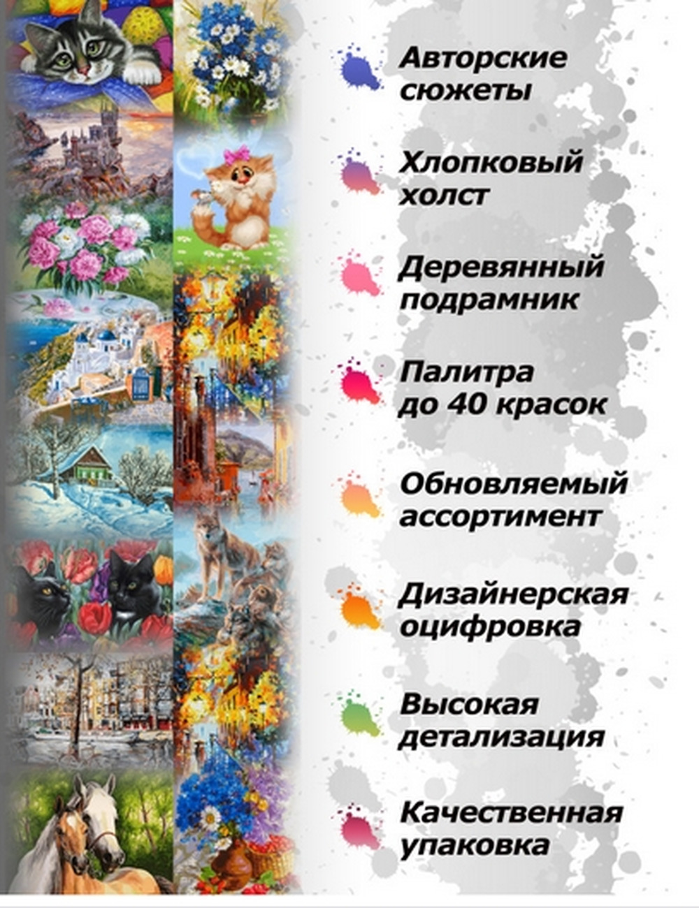 Создайте картину на хлопковом холсте в формате 30*40 см. Комплект ярких акриловых красок расфасован по маленьким пронумерованным баночкам, каждый номер которой соотносится с номером схемы холста. 4 кисти с искусственным ворсом имеют разный размер для удобного раскрашивания маленьких и больших участков картины. Готовую работу можно оформить в багетную раму, подходящую под интерьер, и повесить на стену.