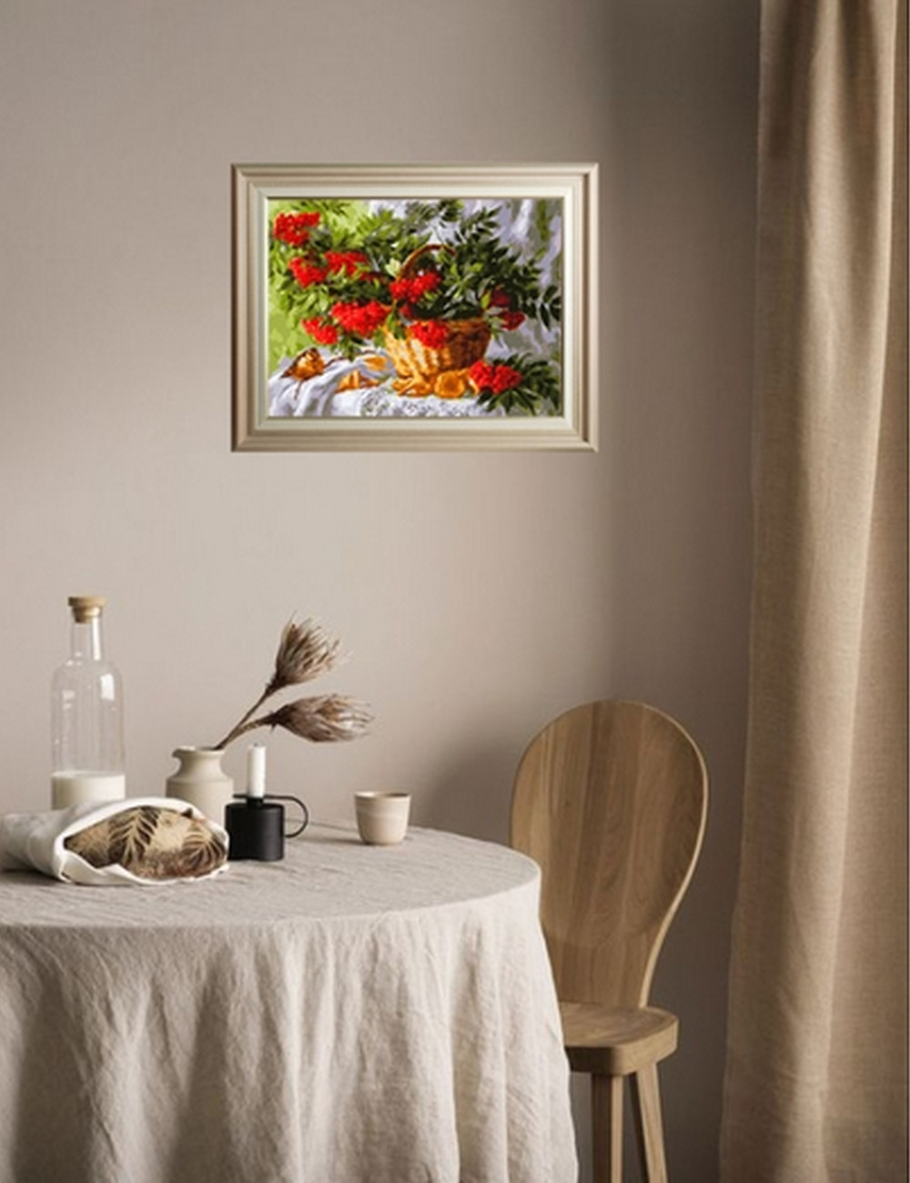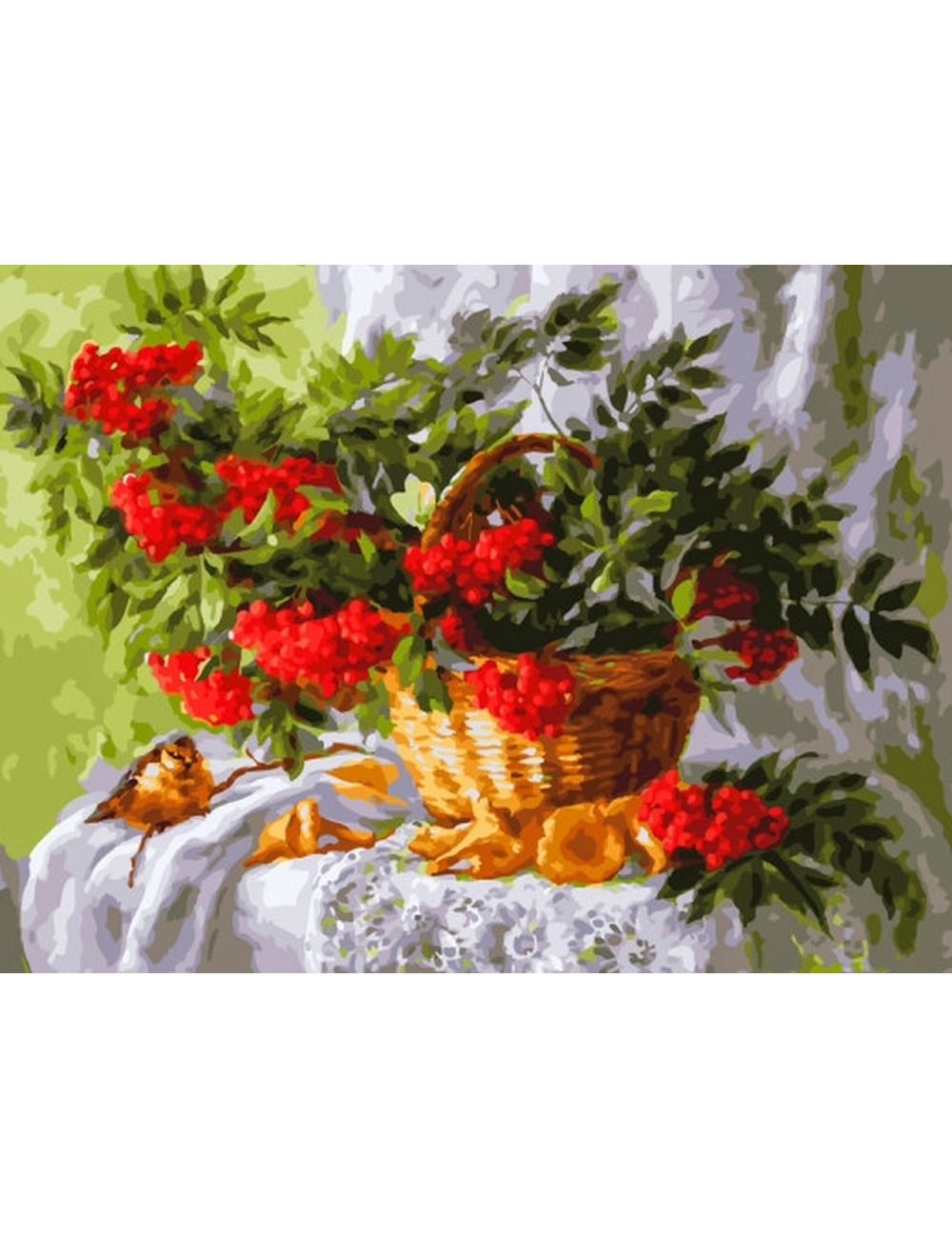 Пришло время сбора лесного урожая! Спелые грозди рябины, маленькие лисички и на страже всего этого богатства сидит птичка, яркий и красивый натюрморт специально адаптирован для раскрашивания по номерам.