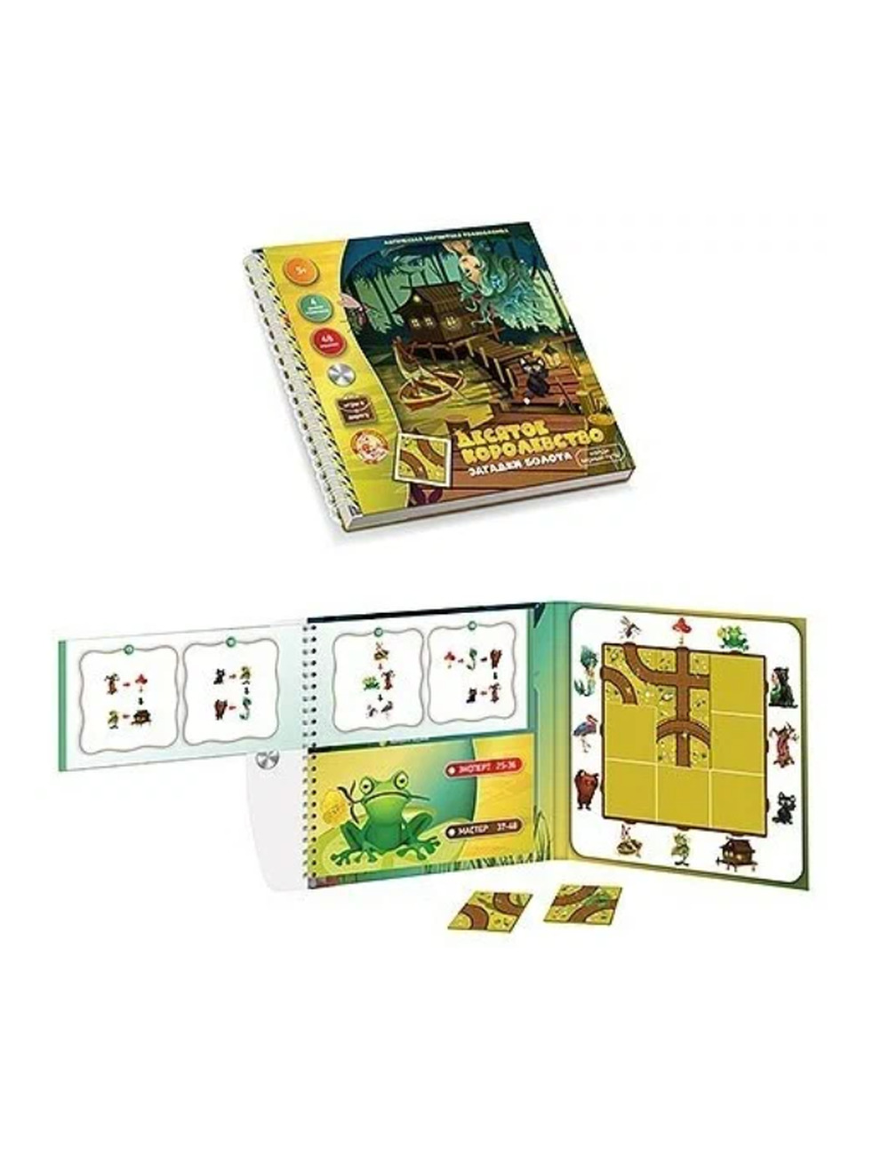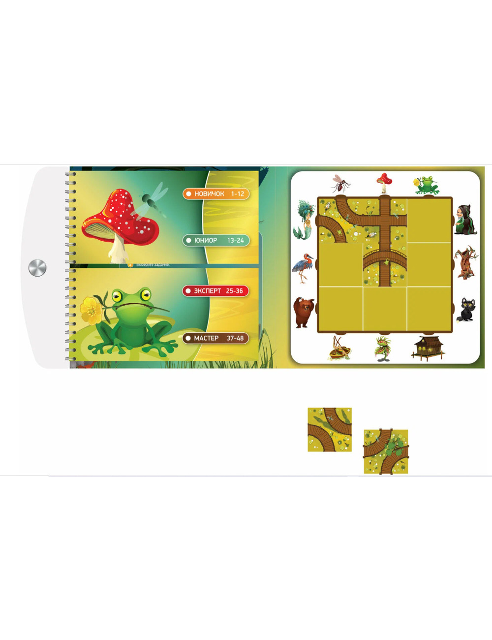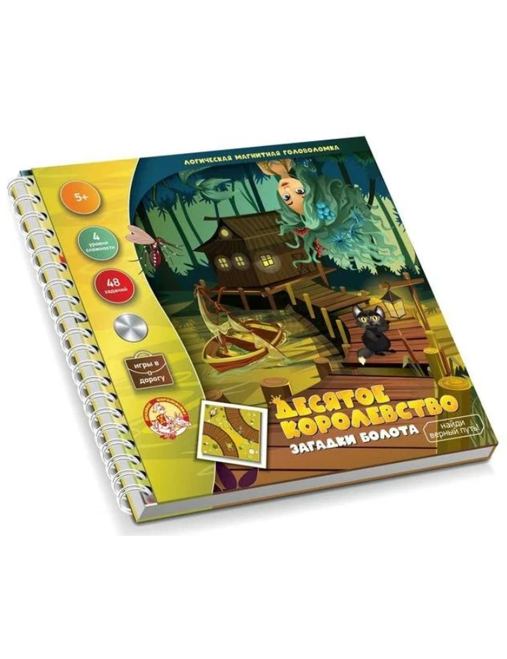 Отправляйтесь в приключение по таинственным топям Десятого королевства с магнитной головоломкой "Загадки болота", чтобы помочь его обитателям прийти друг к другу в гости! Помогите Русалочке навестить Лягушку, а Колдунье - обойти стороной Мишку, правильно проложив дорожки. Выбирайте задание одного из четырёх уровней сложности и прокладывайте тропинки между теми персонажами, которые хотят встретиться. Игра предназначена для детей от 5 лет. Состав игры: магнитные детали - 9 шт. (2,7 х 2,7 см) буклет с 48 заданиями 4 уровней сложности Игра представляет собой книжку на пружинке размером 15,5 х 14,5 см, внутри которой содержится игровое поле и буклет с заданиями. Игру такого формата удобно взять с собой в дорогу, путешествие или общественные места. Как играть? Игрок должен разместить фишки с фрагментами дорожек на игровом поле таким образом, чтобы волшебные обитатели болота смогли добраться друг до друга или же напротив не могли встретиться. Для этого необходимо расположить фишки с тропинками так, чтобы дорожки между волшебными обитателями, отмеченными красной стрелкой, были соединены или отсутствовали, если персонажи из задания помечены перечёркнутой чёрной стрелкой.