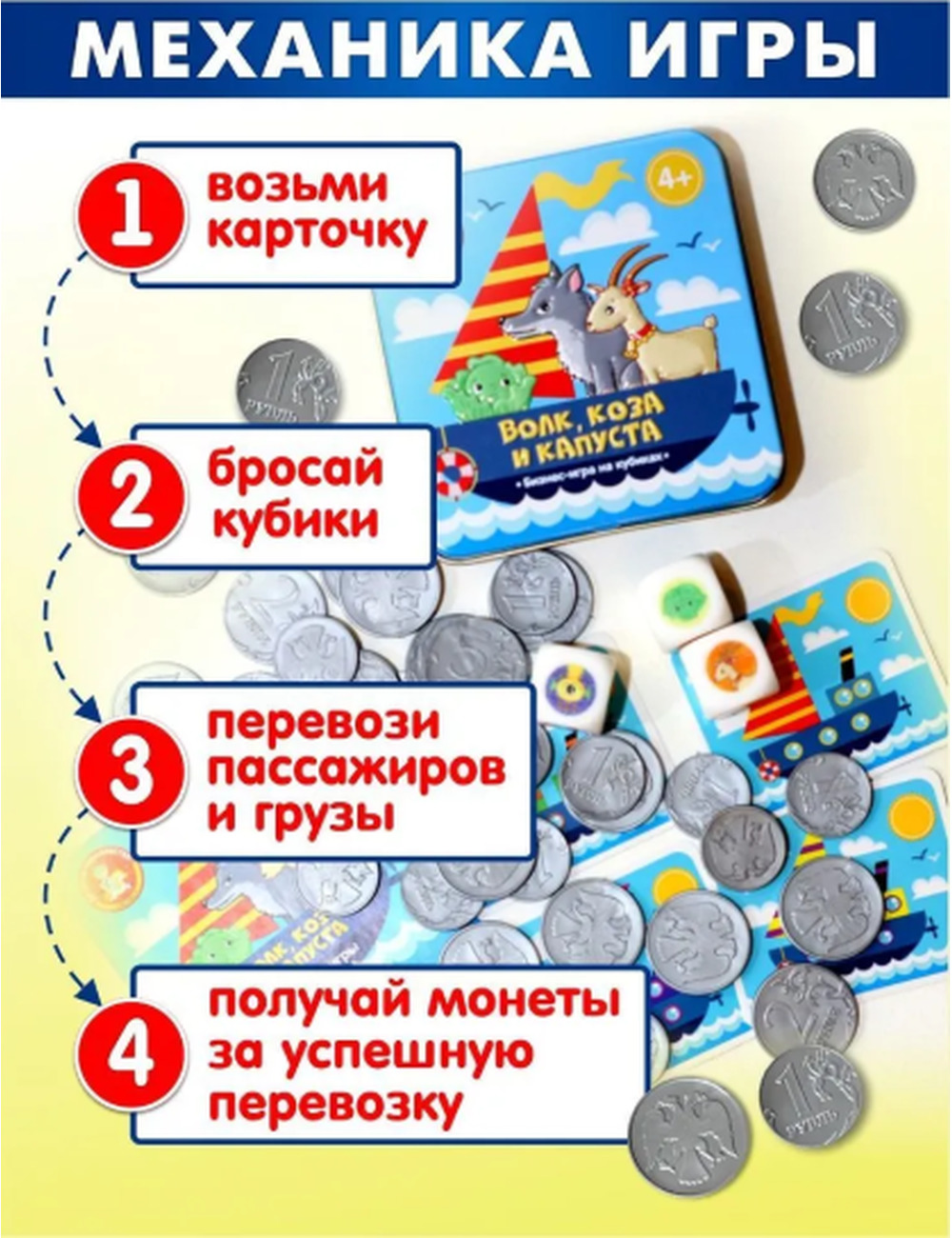 Проверьте себя на логику и везение. Настольная игра для детей «Волк коза и капуста» это iq игра для 2-4 человек, с которой точно не соскучишься. С этой игрой учимся не только думать, но и учимся считать. Как и многие детские настольные игры с кубиком, эта настолка настоящий нейротренажер для банды умников. Для развития ребенка мозг, как и мышцы, должен регулярно тренироваться.