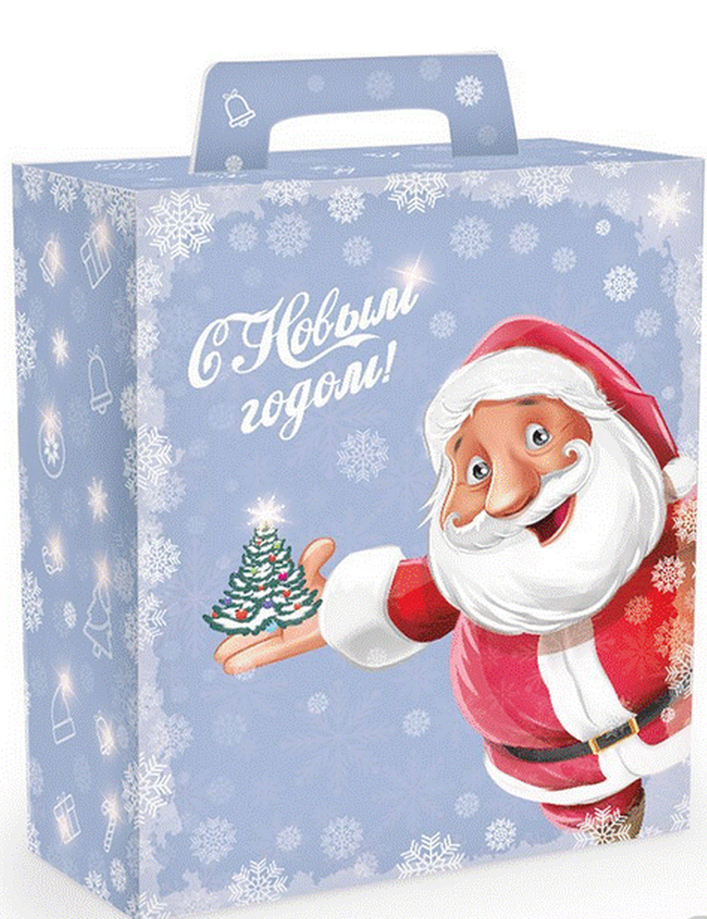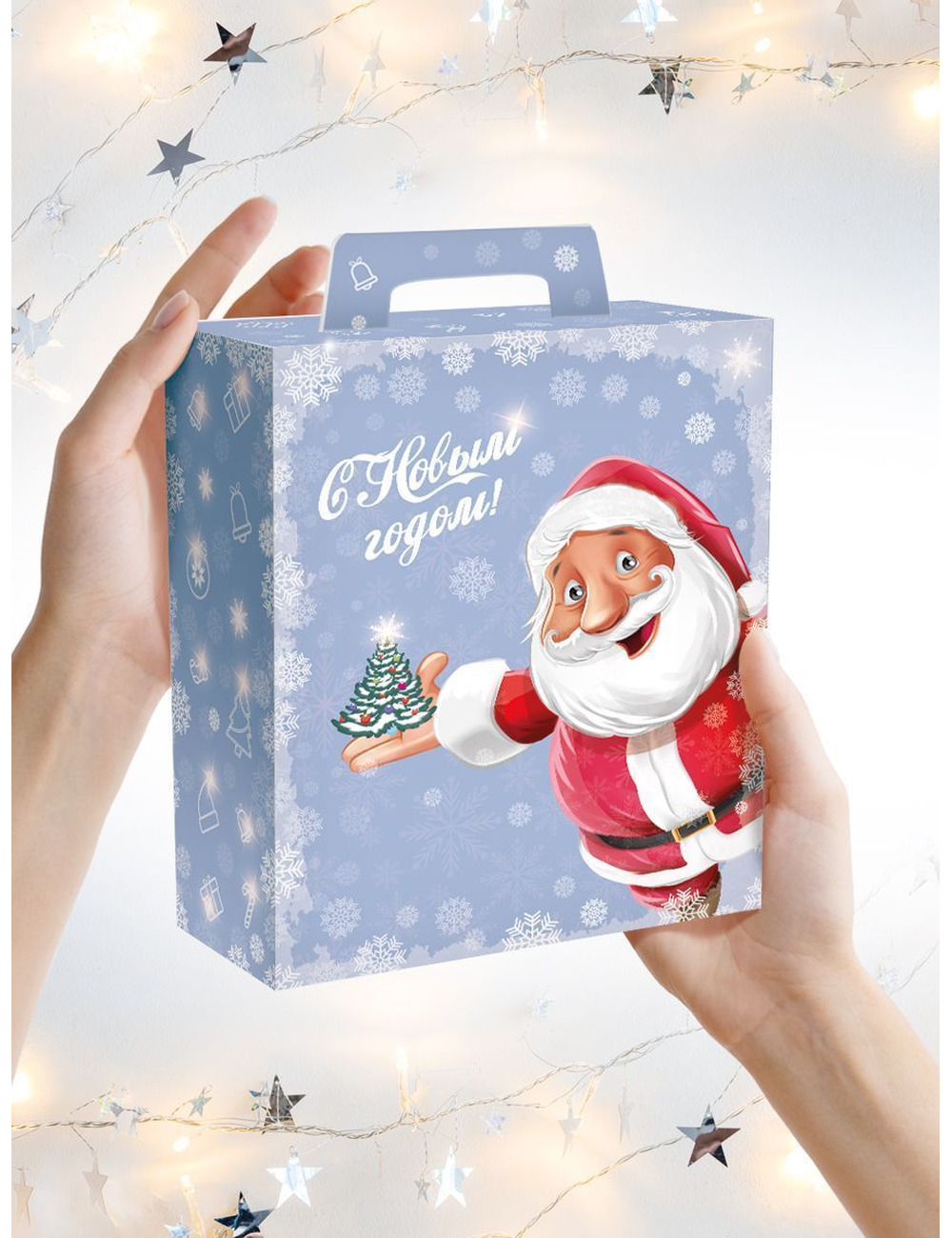 Подарочная коробка в форме чемоданчика с белой поздравительной надписью «С Новым годом!» и радостным Дедушкой Морозом, держащим на ладони маленькую нарядную елочку, станет прекрасной упаковкой для сладкого подарка или небольшого сувенира на зимние праздники.