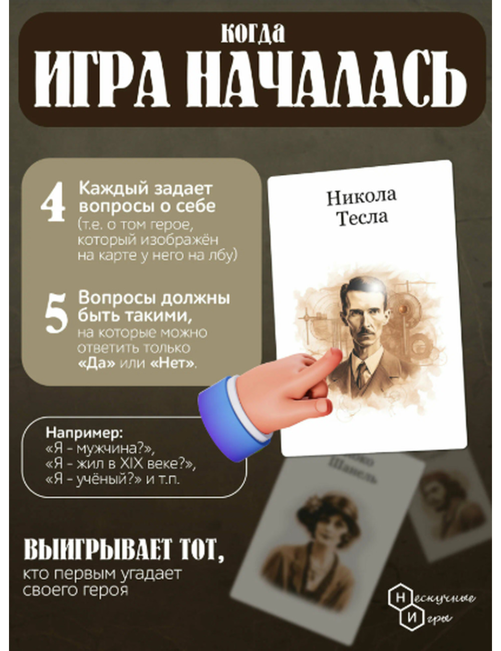 Цель игры - первым угадать своего персонажа, задавая наводящие и получая на них ответы “Да” или “Нет”.