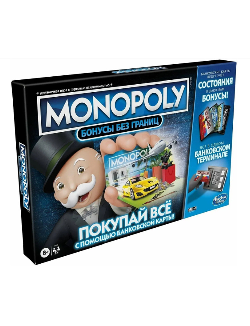 Настольная игра "Монополия: Бонусы без границ" от Hasbro - это семейная версия популярной игры, которая подойдет для детей от 8 лет и старше. В комплекте вы найдете игровое поле, 6 фигурок, банковский терминал, 4 жетона, 4 банковские карты, 16 карточек права собственности, 20 карточек "Шанс", 4 справочные карточки, игральный кубик и инструкцию.
