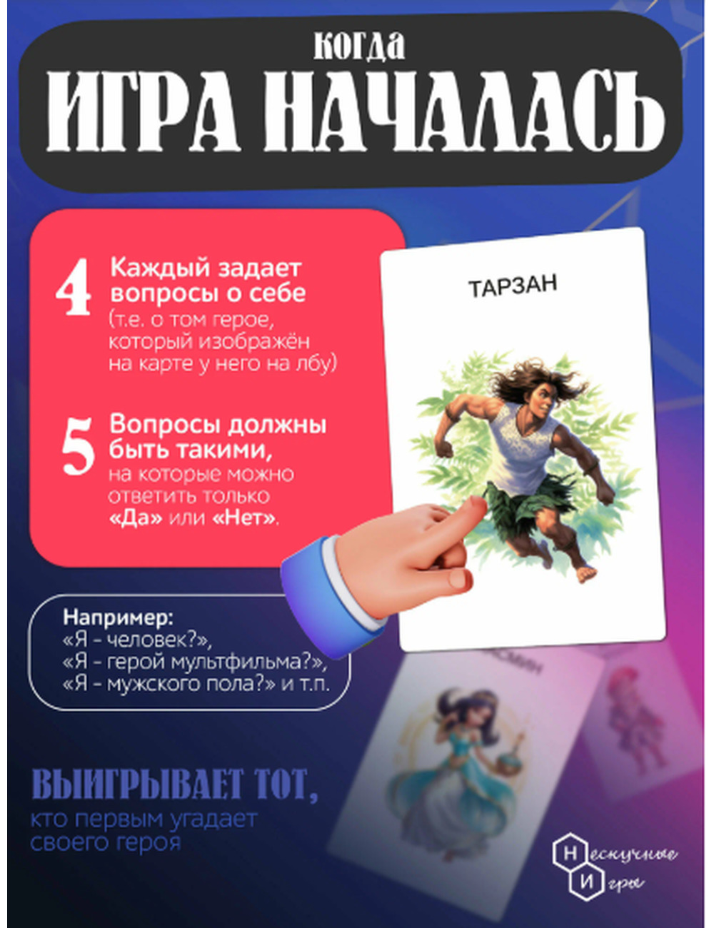 Игроки могут задавать вопросы, связанные с внешностью персонажа, его характером, способностями или ролью в той или иной сказке. Ответы могут быть только “да”, “нет” или “не знаю”.