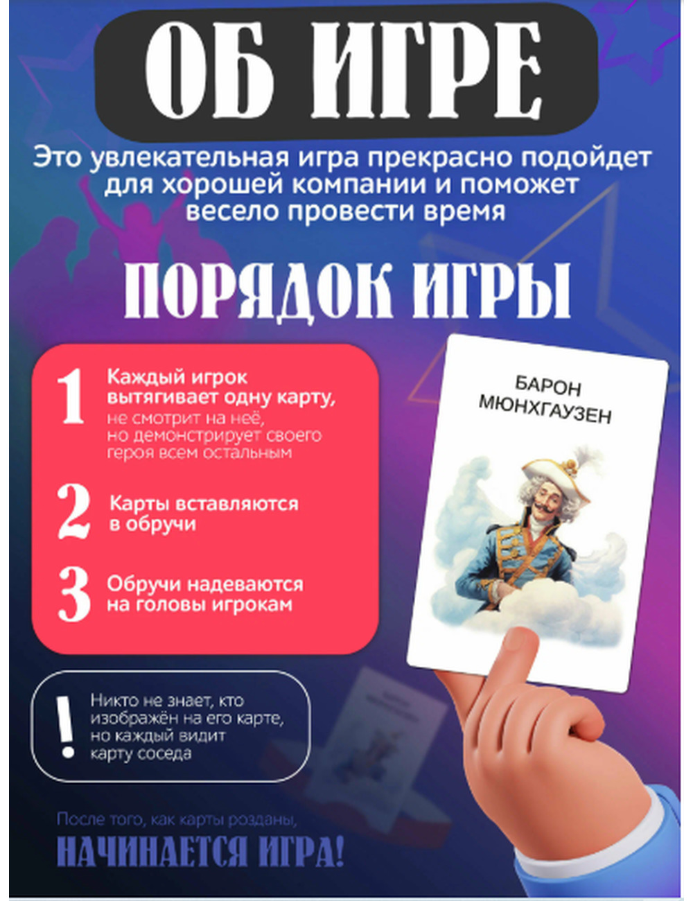 В начале игры каждый участник получает по карточке, на которой изображен персонаж. Задача каждого игрока - угадать, кто он на своей карточке, задавая вопросы другим участникам.