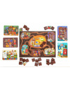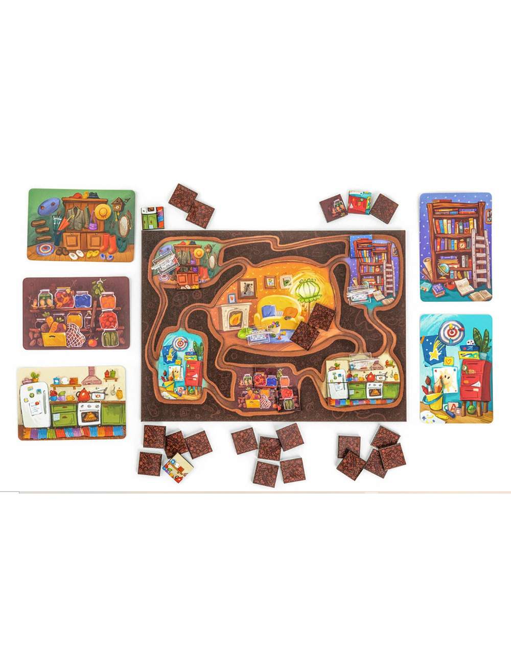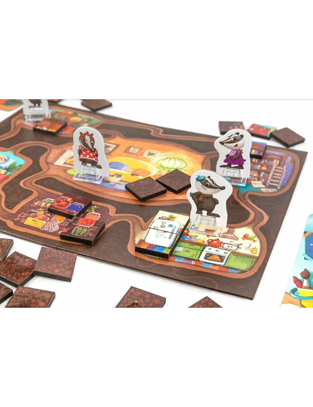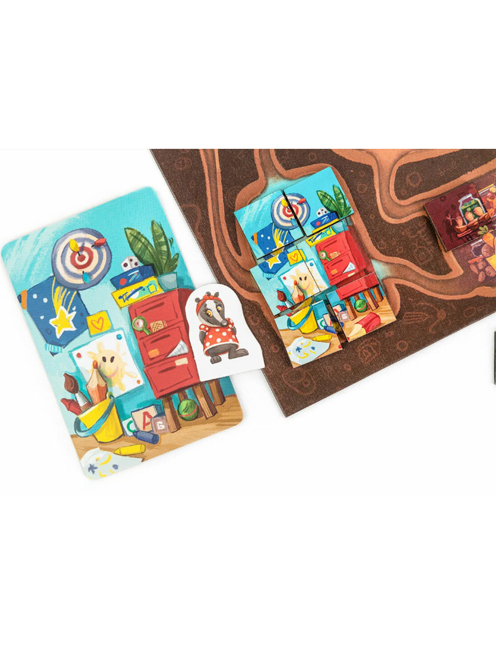 Игровое поле представляет собой нору барсуков с 6 разными комнатами, а каждый пазл - это изображение одной из комнат норы, состоящий из 6 больших деревянных фишек. В начале игры все фишки перемешиваются и выкладываются в комнаты лицом вниз. В ходе игры вы будете переходить своими фигурками барсуков из комнаты в комнату, открывать фишки и переносить их в нужные места. Ваша цель - полностью сложить пазл той комнаты, которая задана на вашей карточки цели! Чья комната первой засияет чистотой и порядком?