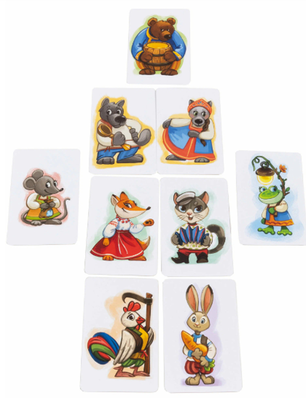 В игре используются яркие карточки с изображениями сказочных персонажей из известной сказки «Терем-Теремок». Игроки должны разместить в своем теремке как можно больше животных, но аккуратно, чтобы не пришел большой медведь и не сломал весь теремок. Это не только весело, но и полезно для развития пространственного мышления, навыков конструирования и умения оценить вероятность.