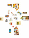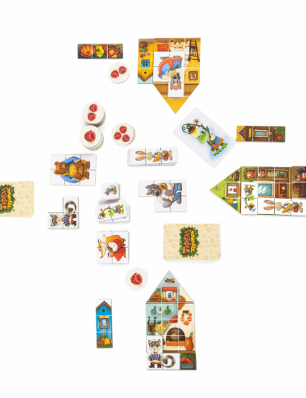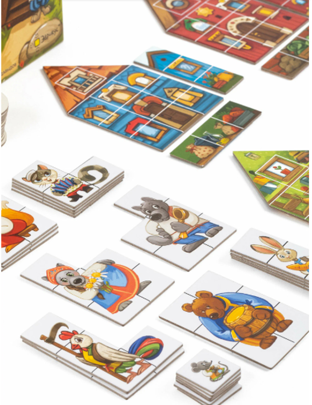 Состав детской настольной игры: 4 двусторонних планшета теремков, 8 двусторонних жетонов пристроек, 27 карточек персонажей, 27 фигур персонажей разной формы, 30 жетонов малинки, правила игры.