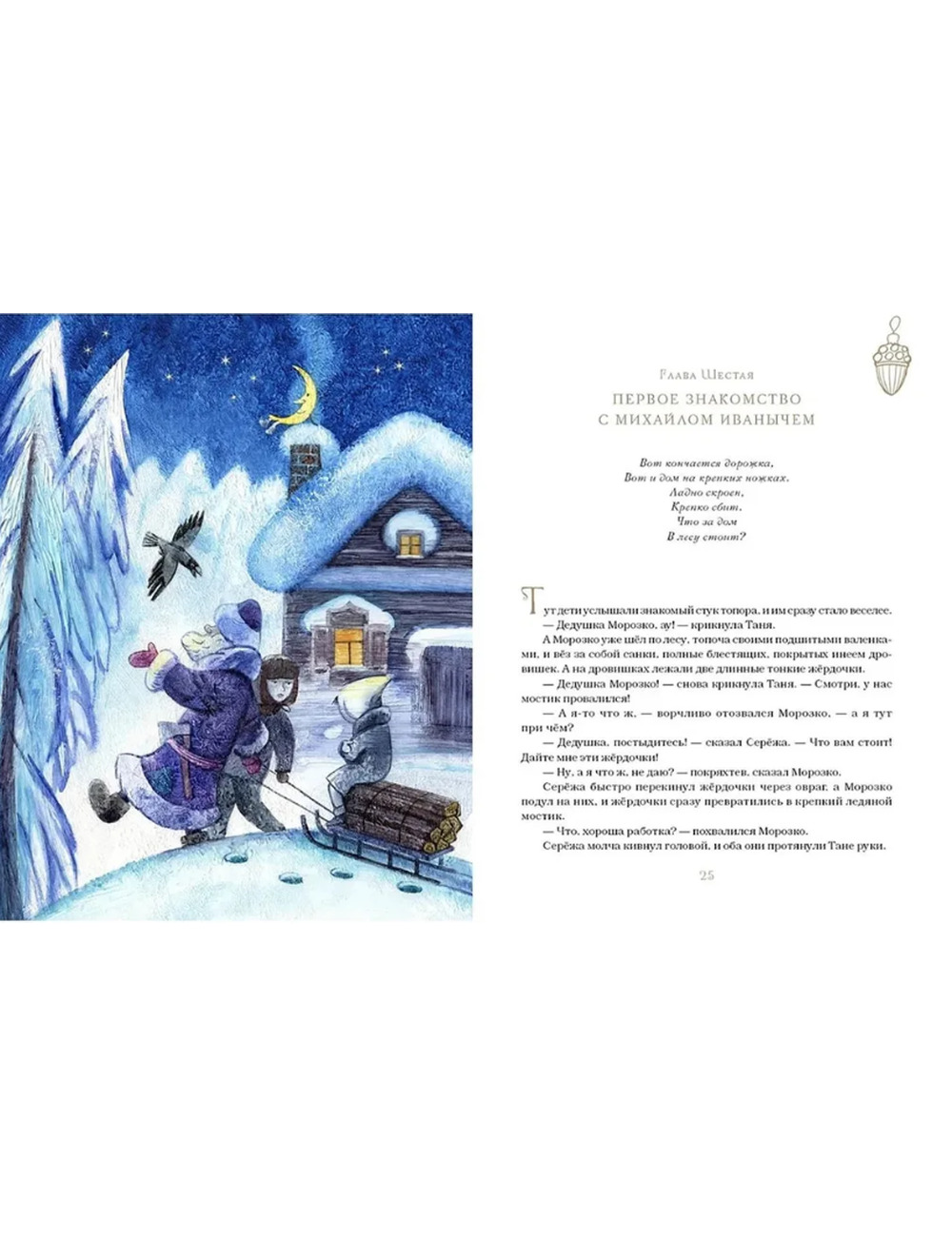 Перед тобой очаровательная новогодняя сказка, которая поможет тебе поверить в чудо. Однажды, в новогодний вечер откроется дверь комнаты, и вместе с морозным облаком войдёт Бабушка Кукла и позовёт тебя в Дом с волшебными окнами. Вместе с юными героями Таней и Серёжей ты окажешься в стране, о которой даже не догадывался. В волшебном зимнем лесу ты встретишь удивительные деревья-великаны, а Господин Ледяной Ветер укажет тебе путь к дому Морозко, где медведь Михайло Иваныч смастерит лучшие лыжи. Преодолев множество испытаний, ты попадёшь в страну Игралочку, где "старые друзья" подскажут, как победить главного врага - Оловянного Генерала, стерегущего заколдованную дорогу к дому с самыми волшебными и родными окнами. Такие же чудесные, как и сама сказка, иллюстрации Марии Спеховой переносят читателей в новогоднюю историю, полную необычайных сюрпризов и радостных впечатлений. Для младшего школьного возраста.