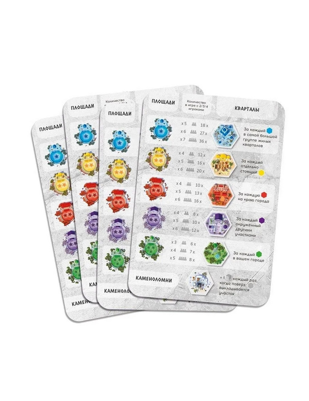 Постарайтесь соблюсти все условия застройки, тем самым повысив престиж города! Стройте на более высоких уровнях – ведь чем выше в городе расположен квартал, тем ценнее он становится, и тем больше победных очков он вам принесёт в конце игры.